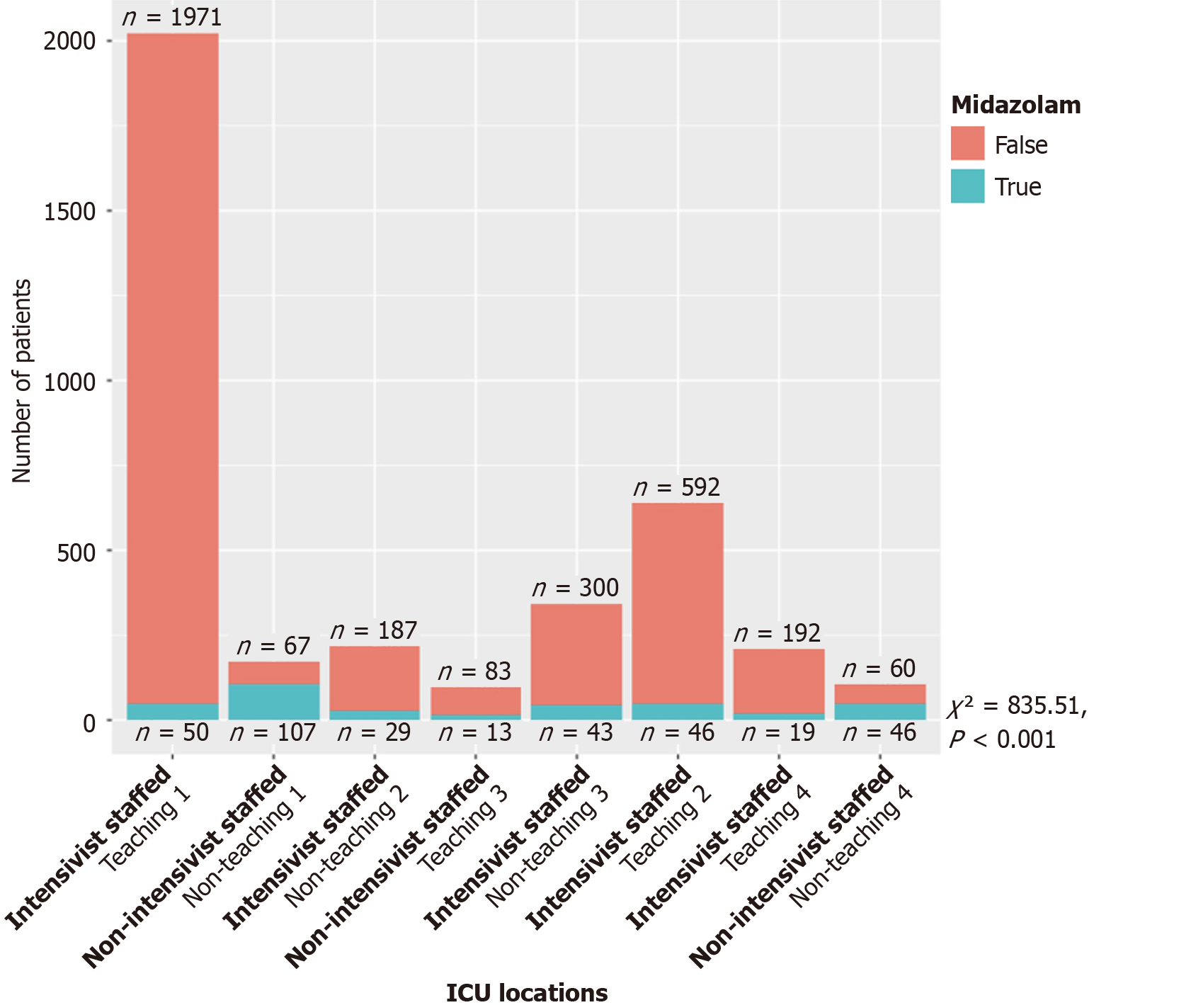 Figure 5 Association of midazolam use and intensive care unit locations.