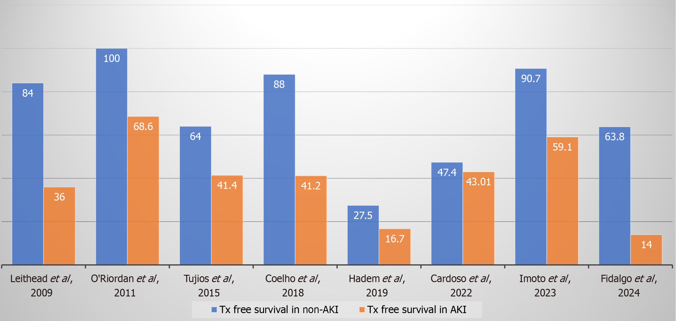 Figure 2 Comparison of liver transplant free survival (%) in non-acute kidney injury vs acute kidney injury.