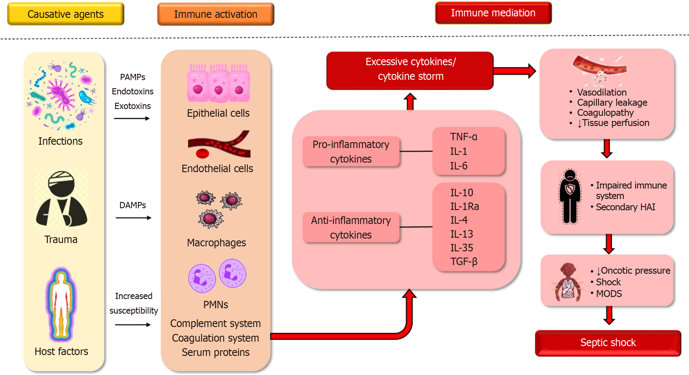 Sepsis poses a significant global health burden and stands as the primary cause of mortality among adult patients in intensive care units (ICUs)[1]. It is a life-threatening medical emergency triggered by the body's exaggerated response to infection, resulting in the widespread release of inflammatory mediators and leading ultimately to organ failure[1-3]. Infectious stimuli trigger both pro- and anti-inflammatory responses, affecting multiple systems, and may lead to hyperinflammatory response or sepsis-associated immunosuppression[4,5]. The heightened inflammatory response referred to as "cytokine storm", is marked by increased levels of key cytokines such as tumor necrosis factor-alpha, interleukin (IL)-1β, IL-6, IL-8, IL-10, etc. Consequently, this excessive release of inflammatory mediators plays a crucial role in the development and progression of shock and organ failure, also termed as Sepsis Associated Organ Failure as measured by SOFA score[6]. Sepsis is diagnosed clinically by a ≥ 2-point increase in the SOFA score, correlating with a high mortality. Septic shock, an even more critical form of sepsis, is characterized by significant cellular, metabolic, coagulopathic and circulatory dysfunction, including a lactate level greater than 2 mmol/L and the need for vasopressors to maintain mean arterial pressure (MAP) ≥ 65 mmHg despite adequate fluid resuscitation[2]. It has a complex pathophysiology as shown in Figure 1.