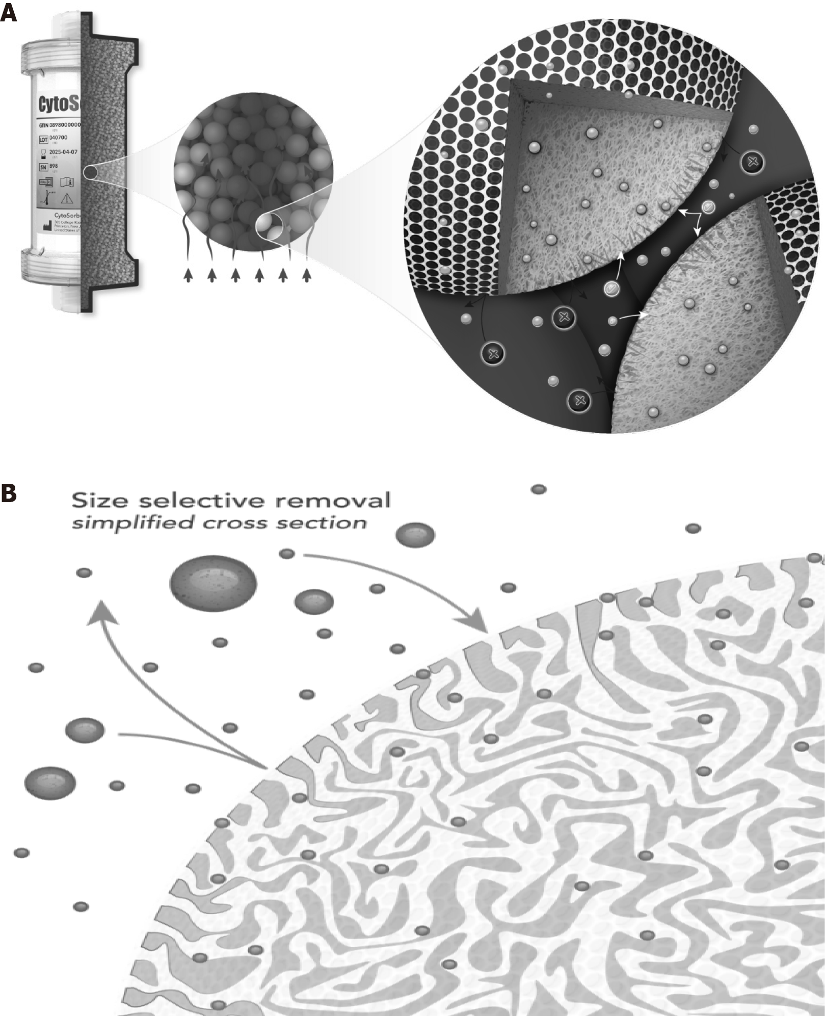 A: CytoSorb adsorber-bead based technology; B: CytoSorb size selective removal.