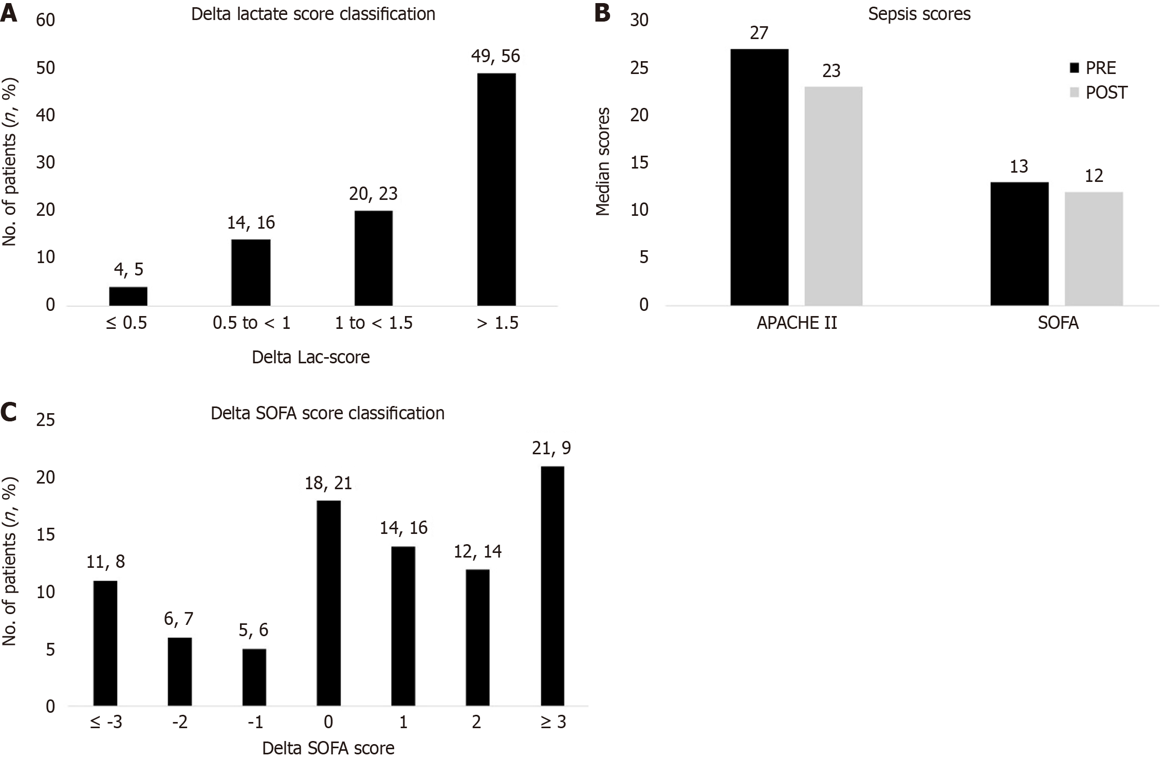 A: Delta lactate score classification; B: Comparison of sepsis scores; C: Delta sepsis associated organ failure score classification. SOFA: Sepsis Associated Organ Failure; APACHE II: Acute Physiology and Chronic Health Evaluation; PRE: Values recorded pre/before CytoSorb; POST: Values recorded post/after CytoSorb.