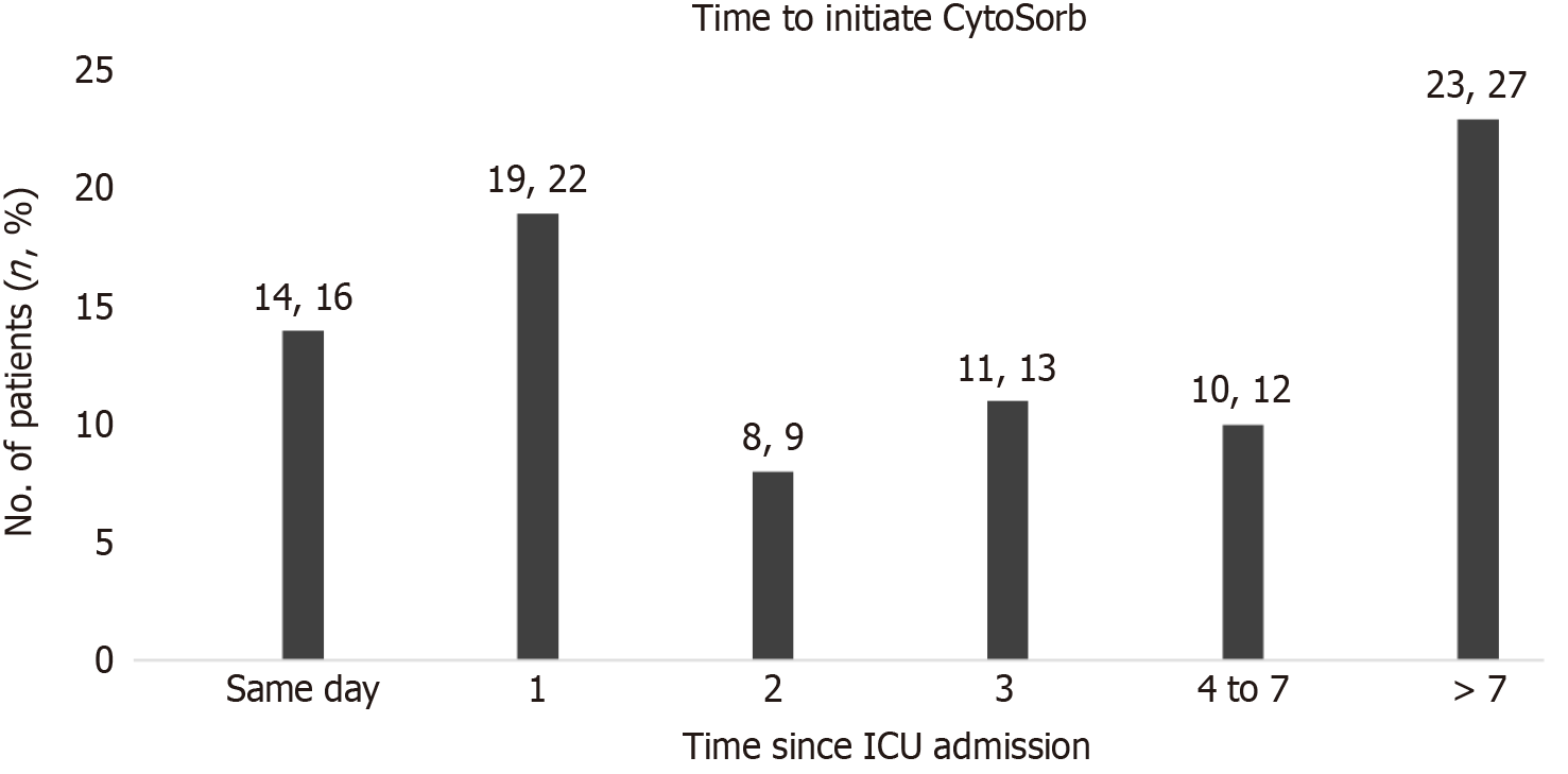 Number of CytoSorb® devices used, days spent in ICU and overall stay in hospital: Using the clinicians’ designed scoring system[30] for initiation of CytoSorb® therapy the ICU score at admission was < 8 in 3 (3.45%) patients, between 8 and 13 in 57 patients (65.5%) and > 13 in 27 patients (31.03%). It is important to note that over 96% of the CytoSorb usage was clinically indicated in patients with scores > 8. Most patients received one CytoSorb® treatment only (n = 43, 49.4%), 25 patients underwent two therapy sessions (28.7%), 11 patients received three CytoSorb® (12.6%) and only 8 patients (9.2%) underwent 4 or more therapy sessions. The different types of dialysis treatment given were CRRT (n = 77, 88.5%), slow low efficiency dialysis (SLED) (n = 4, 4.6%), CRRT + SLED (n = 4, 4.6%) and two patients (n = 2, 2.3%) required ECMO in addition to CRRT (Table 3). Out of a total of 87 patients, 14 (16.47%) began CytoSorb® therapy on the same day of ICU admission. However, patients to whom therapy was initiated between 12-24 hours and 24-48 hours were 19 (22.35%) and 8 (9.41%) respectively. A few patients, 11 (12.94%), were given therapy after 72 hours and 10 (11.76%) patients were given it4 to 7 days post ICU admission while 23 (27.03%) were initiated with CytoSorb therapy one week after ICU admission (Figure 4). A high proportion (96%) of patients required mechanical ventilation, with a median duration of mechanical ventilation for 12 days (IQR: 6-16). The median length of hospital stay in overall patients was 26 days (IQR: 14.5-49), while the median ICU stay was 18 days (IQR: 13-32) underlying the severe subset of patients.