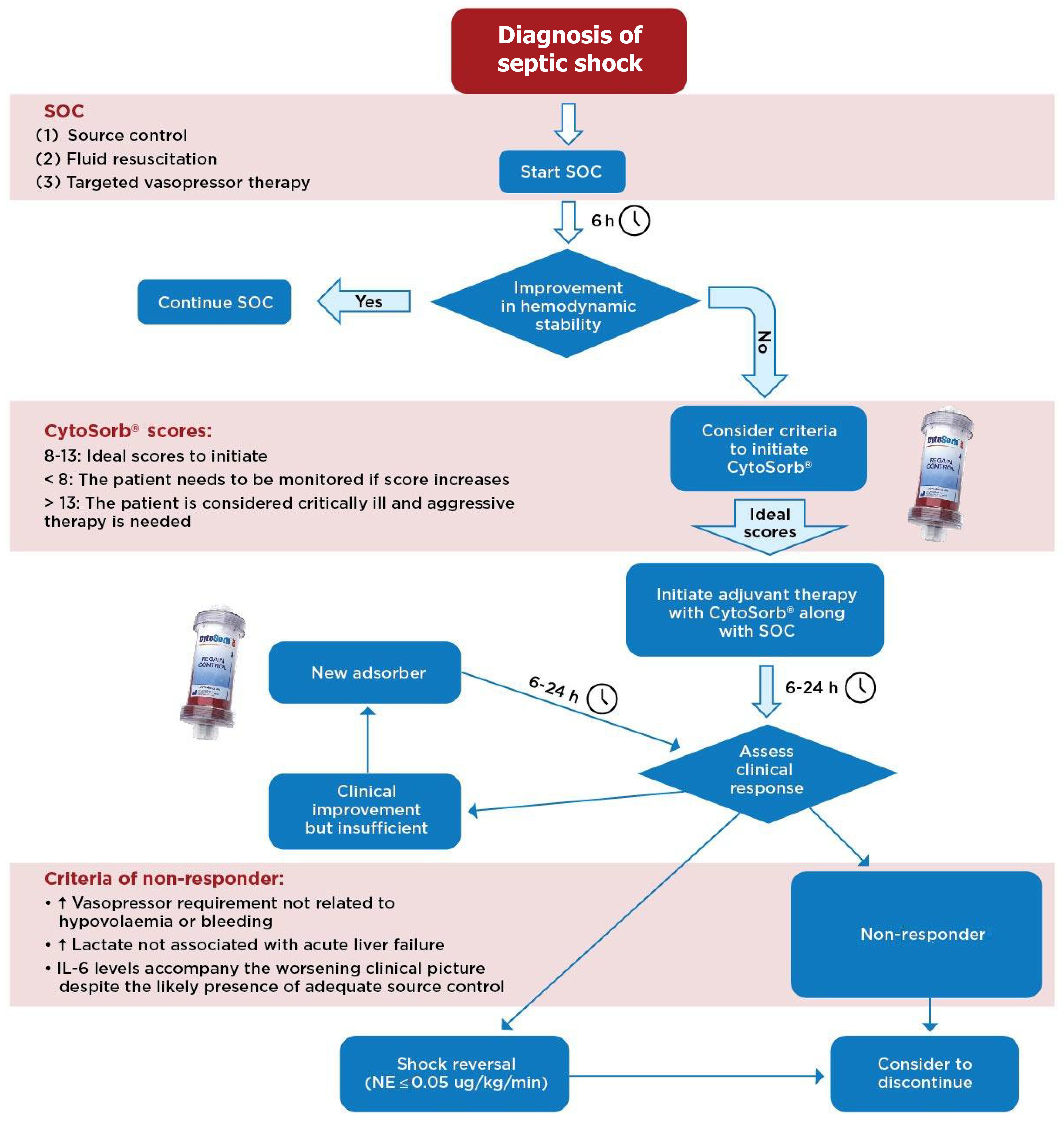 The Indian expert consensus on the use of extracorporeal hemoadsorption in septic shock endorses and provides guidance on using CytoSorb® haemoadsorption as an adjuvant treatment for septic shock to achieve optimal outcomes. Although, standard care for septic shock emphasizes source control, appropriate anti-infectives, fluid therapy, and catecholamines, a score principles, it does not adequately address the organ dysfunction associated with dysregulated immune response. For patients who do not respond adequately to the standard treatments, CytoSorb® haemoadsorption therapy can facilitate restoration of immune balance by removing excessive inflammatory mediators like PAMPs, DAMPs, and cytokines, thereby addressing the underlying putative mechanism[14]. Figure 5 illustrates the treatment flow recommended by the Indian expert consensus[11,14,21,29], and our study tried to align with these recommendations as good as this was possible in our setting.