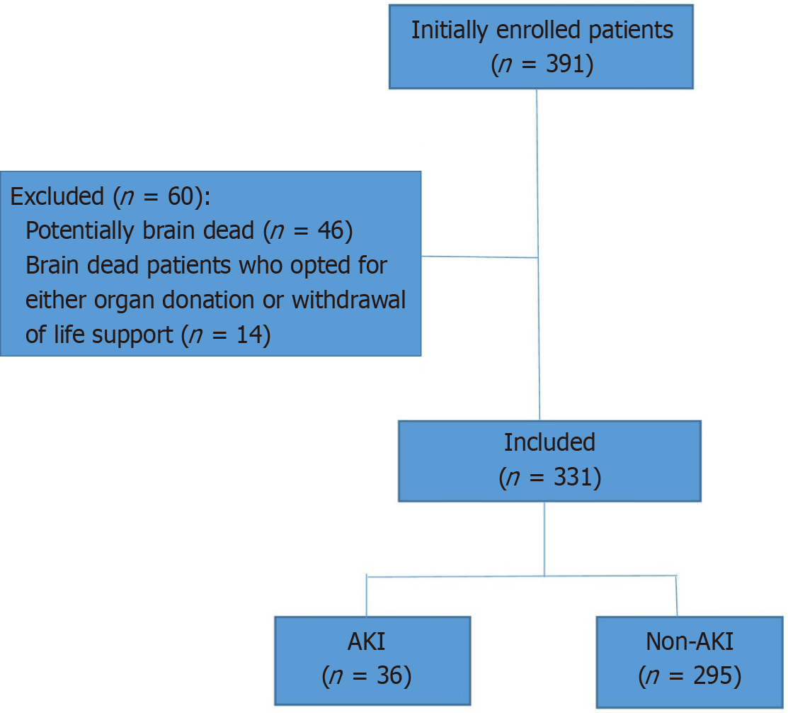 Initially, we enrolled a total of 391 patients with TBI with an admission GCS ≤ 11 in the study; however, we later excluded 60 patients who belonged to two categories: (1) Patients who were potentially brain dead, had severe TBI with GCS 3 on admission, and had the absence of at least one brain stem reflex (n = 46); and (2) Patients after the development of brain death who opted for either organ donation or withdrawal of life support (n = 14) (Figure 1). Included patients were divided into two groups, the non-AKI group, and the AKI group, according to the KDIGO 2012 clinical practice definition.