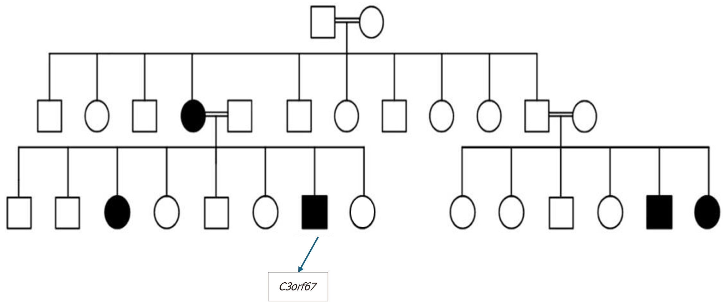 Figure 1 Family pedigree of the patient - the pedigree highlights affected individuals with a black fill, consanguinity is indicated with a double line, and genotype information is annotated.