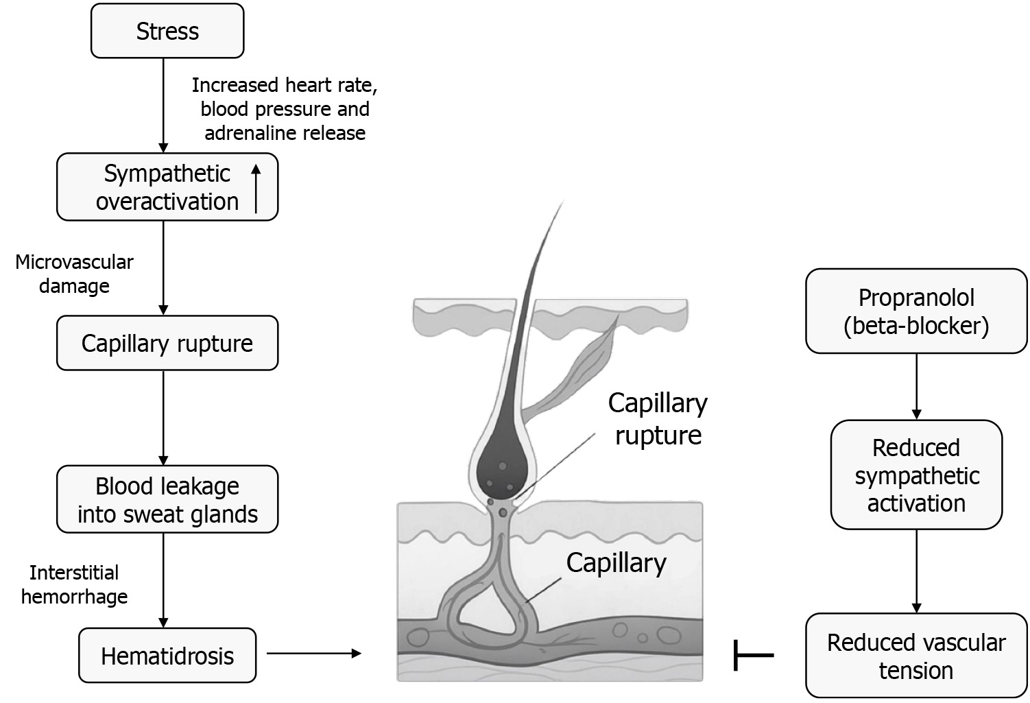 This illustration depicts the proposed mechanism by which propranolol mitigates hematidrosis. Stress triggers sympathetic overactivation, leading to increased heart rate, blood pressure, and adrenaline release. This heightened sympathetic response causes microvascular damage, resulting in capillary rupture and subsequent blood leakage into sweat glands via interstitial hemorrhage, ultimately manifesting as hematidrosis. Propranolol, a beta-blocker, reduces sympathetic activation and vascular tension, thereby preventing capillary rupture and reducing bleeding episodes.