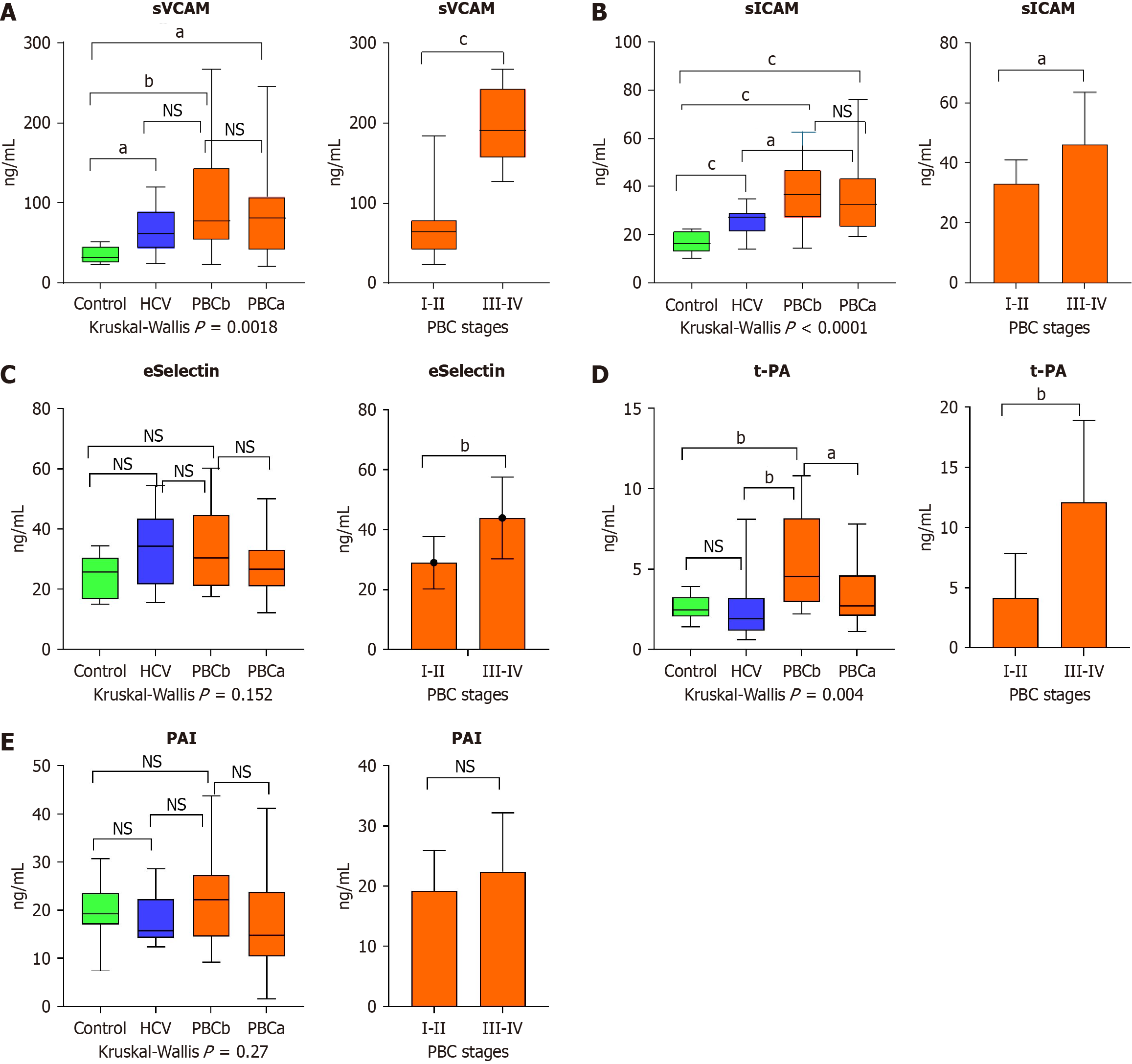 Values for early (18 patients) and late primary biliary cholangitis (12 patients) are also presented. A: Soluble vascular cell adhesion molecule levels; B: Soluble intercellular adhesion molecule levels; C: Soluble E selectin levels; D: Serum tissue plasminogen activator; E: Serum plasminogen activator inhibitor-1. aP < 0.05, bP < 0.01, cP < 0.001. NS: Not significant; sVCAM: Soluble vascular cell adhesion molecule; HCV: Hepatitis C virus; PBCb: Primary biliary cholangitis before treatment with ursodeoxycholic acid; PBCa: Primary biliary cholangitis after treatment with ursodeoxycholic acid; PBC: Primary biliary cholangitis; sICAM: Soluble intercellular adhesion molecule levels; eSelectin: Soluble E-selectin; t-PA: Tissue plasminogen activator; PAI: Plasminogen activator inhibitor 1.