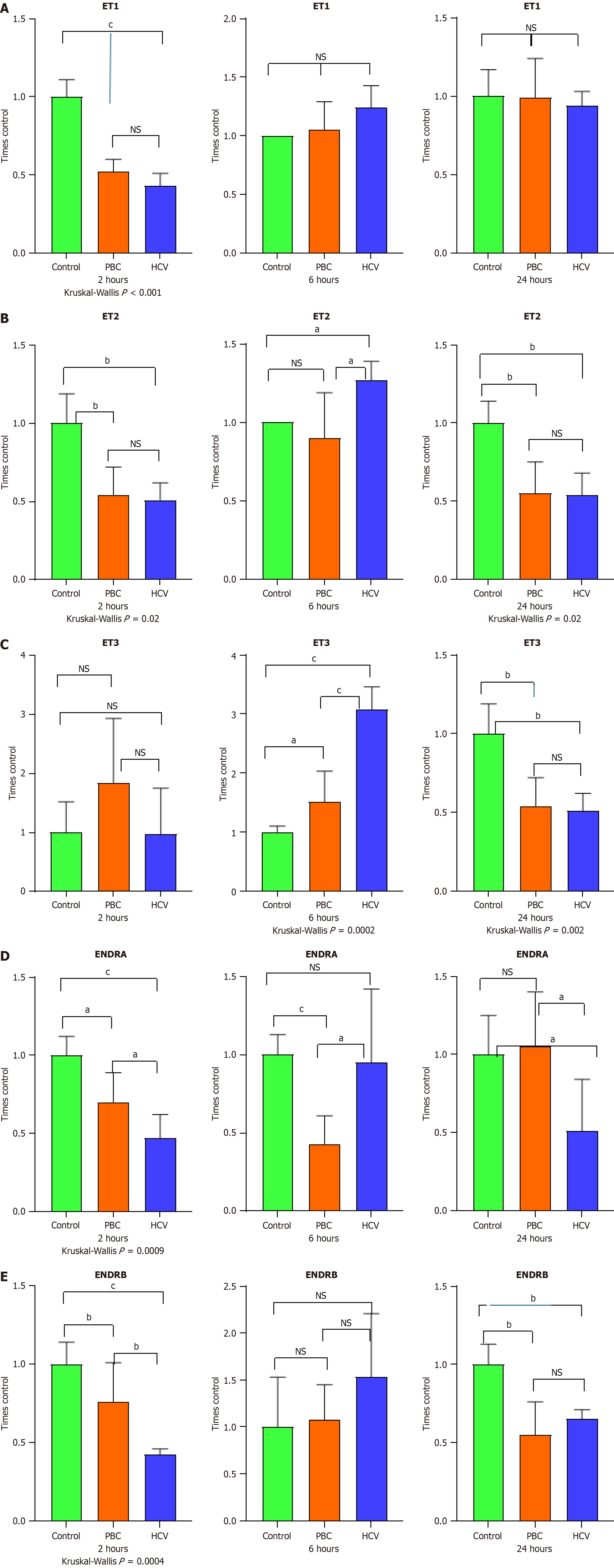 hy926 cells after incubation with serum from primary biliary cholangitis and chronic hepatitis C virus patients compared to controls considered as 1.0. Each bar represents the mean ± SD of 5 experiments. A: Endothelin 1 expression; B: Endothelin 2 expression; C: Endothelin 3 expression; D: Endothelin receptor A expression; E: Endothelin receptor B expression. aP < 0.05, bP < 0.01, cP < 0.001. NS: Not significant; ET: Endothelin; PBC: Primary biliary cholangitis; HCV: Hepatitis C virus; ENDRA: Endothelin receptor A; ENDRB: Endothelin receptor B.