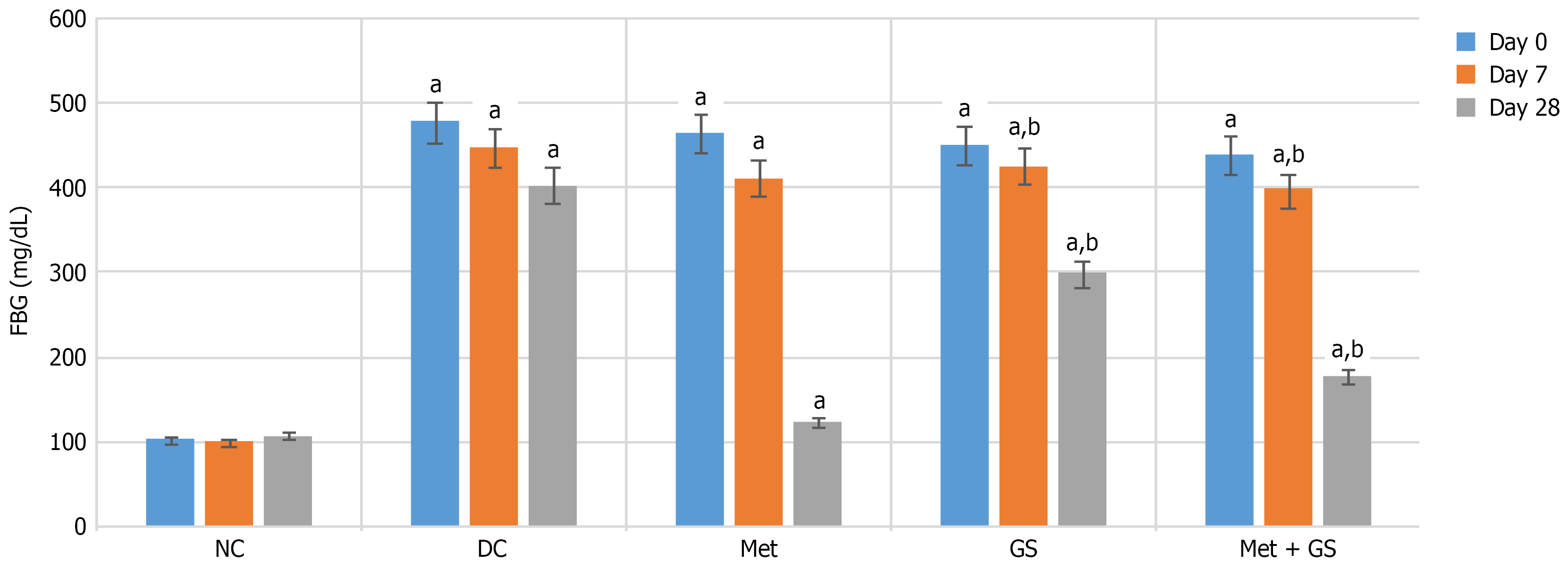 Figure 2 Fasting blood glucose (mg/dL) at day 0, day 7, and day 28.