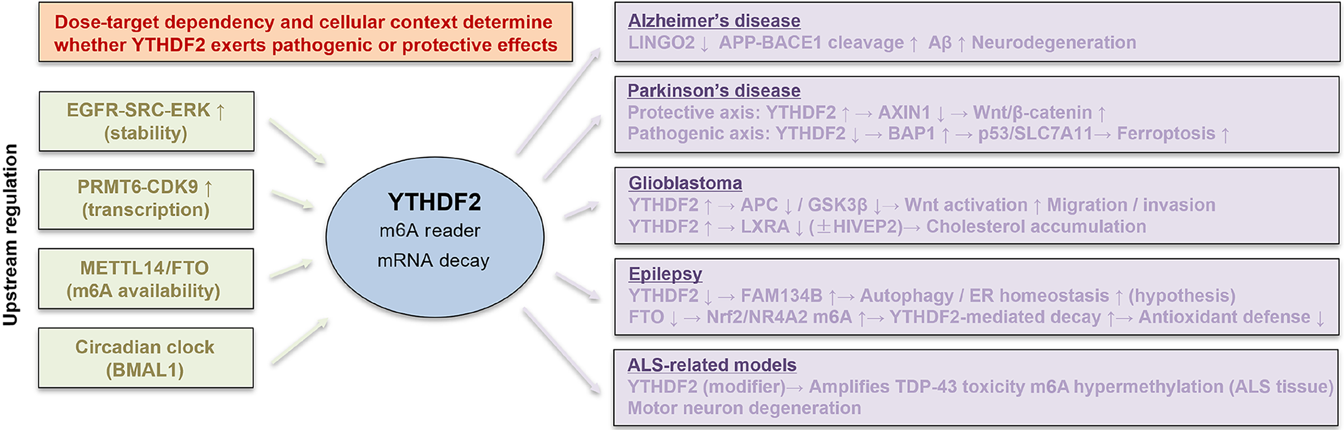 This schematic illustrates how YTH structural domain family (YTHDF) 2 integrates upstream regulatory inputs, including N6-methyladenosine writers/erasers, signaling pathways, and circadian mechanisms, to selectively promote decay of N6-methyladenosine-marked mRNAs. Depending on disease context, cell type, and target dosage, YTHDF2 regulates distinct downstream pathways across Alzheimer’s disease, Parkinson’s disease, glioblastoma, epilepsy, and amyotrophic lateral sclerosis-related models, resulting in either pathogenic or protective outcomes. The figure highlights a dose-target dependency framework, in which the balance between vulnerable and protective mRNA targets determines the net biological impact of YTHDF2 in central nervous system disorders. YTHDF2: YTH structural domain family protein 2; EGFR: Epidermal growth factor receptor; SRC: SRC proto-oncogene, non-receptor tyrosine kinase; ERK: Extracellular signal-regulated kinase; PRMT6: Protein arginine methyltransferase 6; CDK9: Cyclin dependent kinase 9; METTL14: Methyltransferase like 14; FTO: Fat mass and obesity-associated protein; BMAL1: Brain and muscle ARNT-Like 1; m6A: N6-methyladenosine; LINGO2: Leucine rich repeat and immunoglobulin domain containing 2; APP: Amyloid precursor protein; BACE1: Beta-secretase 1; AXIN1: Axis inhibition protein 1; BAP1: Breast cancer type 1 susceptibility protein associated protein-1; SLC7A11: Solute carrier family 7 member 11; APC: Adenomatous polyposis coli; GSK3β: Glycogen synthase kinase 3 beta; LXRA: Liver X receptor alpha; HIVEP2: Human immunodeficiency virus type I enhancer binding protein 2; FAM134B: Family with sequence similarity 134 member B; ER: Endoplasmic reticulum; Nrf2: Nuclear factor erythroid-2-related factor 2; NR4A2: Nuclear receptor subfamily 4 group a member 2; TDP-43: TAR DNA-binding protein 43; ALS: Amyotrophic lateral sclerosis.