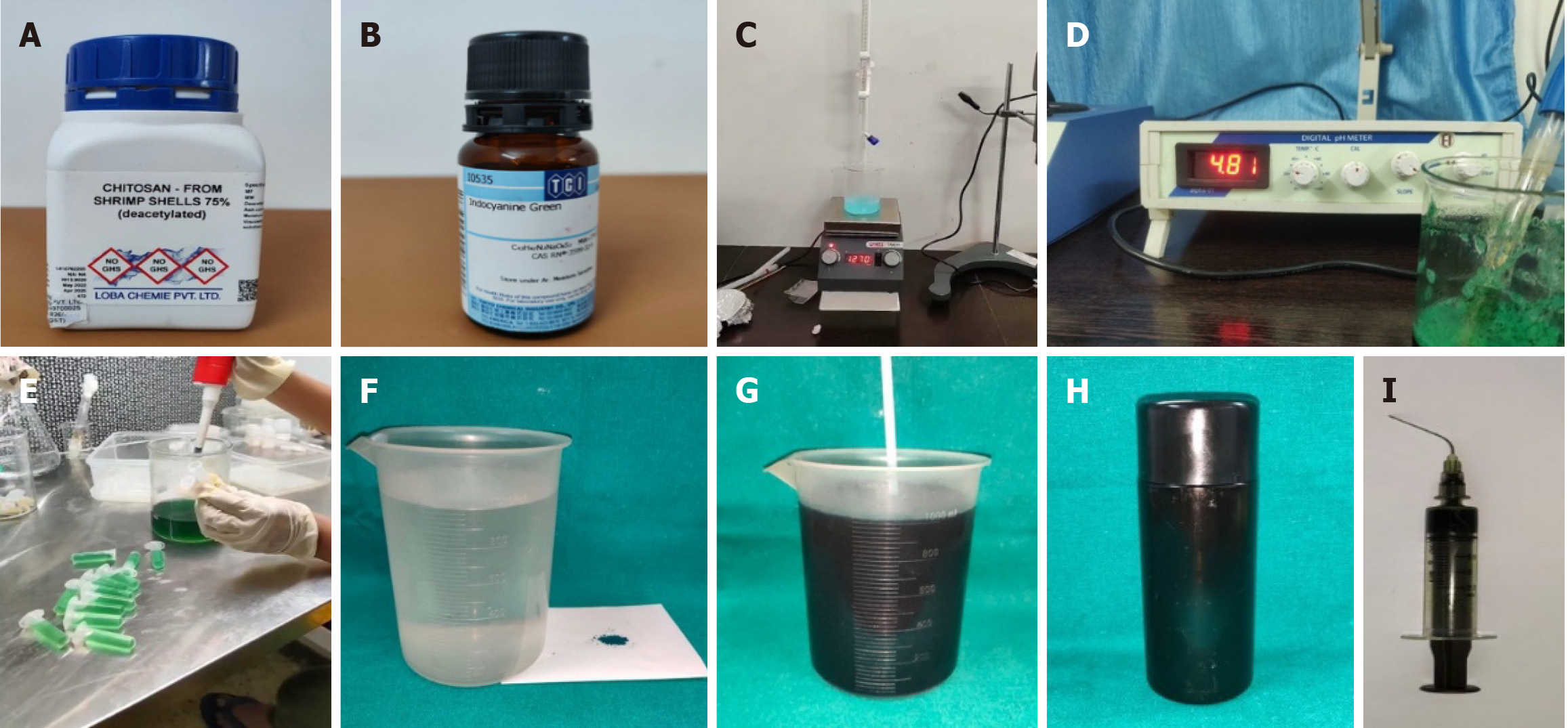 A: Chitosan powder from shrimp shells 75% (deacetylated) (LOBA CHEMIE PVT. LTD.); B: Indocyanine Green Powder (Tokyo Chemical Industry Co., Ltd); C: Chitosan nanoparticles and indocyanine green dye is being mixed in magnetic stirrer; D: Digital pH meter showing pH of 4.8 of the mixed dye; E: Mixed photosensitizer is proceeded for lyophilization; F: 100 mg of indocyanine green-doped chitosan nanoparticles and 1000 mL of distilled water; G: Stirred with stirrer; H: Photosensitizer solution stored in amber coloured bottle to protect it from natural light; I: Photosensitizer solution loaded in 3 mL disposable syringe.