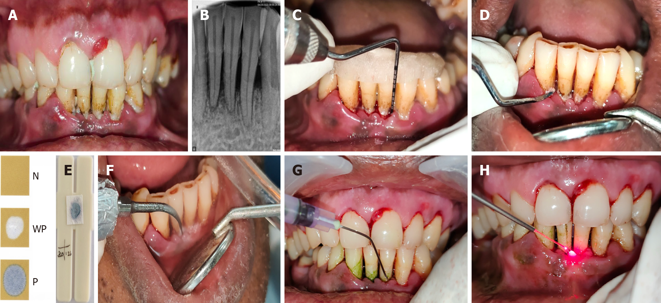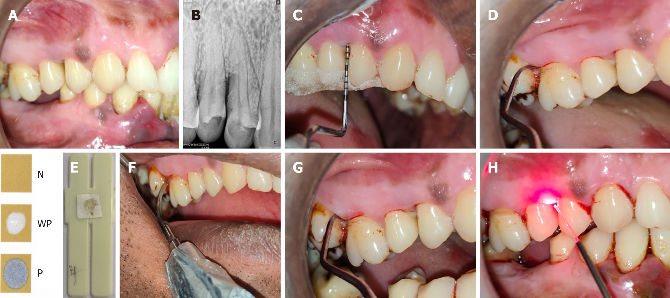 A: Pre-operative clinical picture for control site; B: Pre-operative radiograph of control site; C: Customized acrylic stent in control site with baseline parameters recorded pocket probing depth - from gingival margin, relative clinical attachment level - from apical end of the groove made in stent; D: Collection of plaque sample from control site for microbiological evaluation; E: Test result being compared with interpretation chart (BANA-zyme test kit) showing faint blue colour- weakly positive result[27]; F: Ultrasonic scaling being performed at the control site; G: Root planing being performed at the control site; H: Application of laser irradiation at control site.