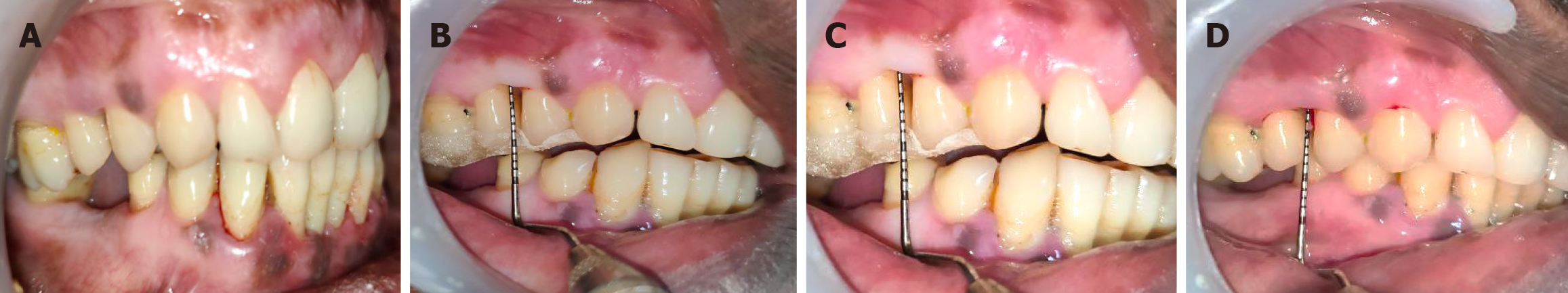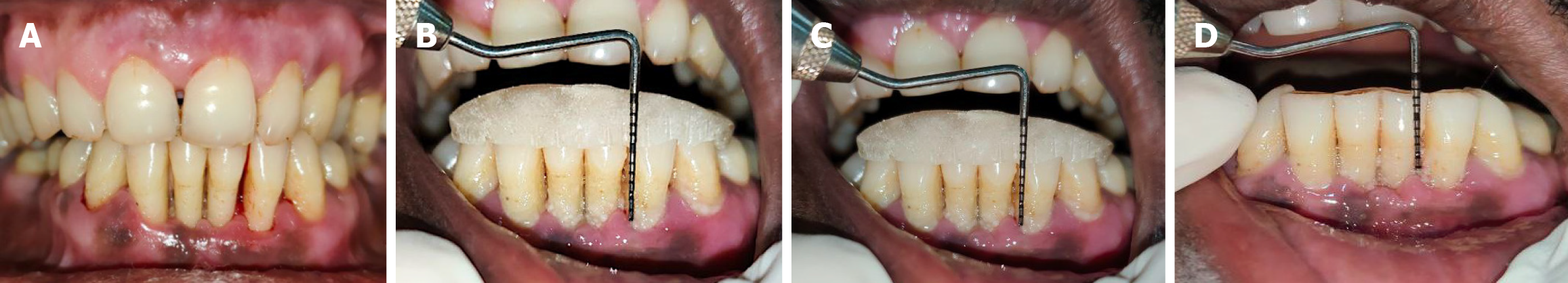 A: Follow-up of control site (7 days post-operative); B: Follow-up of control site (1 month post-operative) with evaluation of clinical periodontal parameters; C: Follow-up of control site (3 months post-operative) with evaluation of relative clinical attachment level; D: Follow-up of control site (3 months post-operative) with evaluation of pocket probing depth.