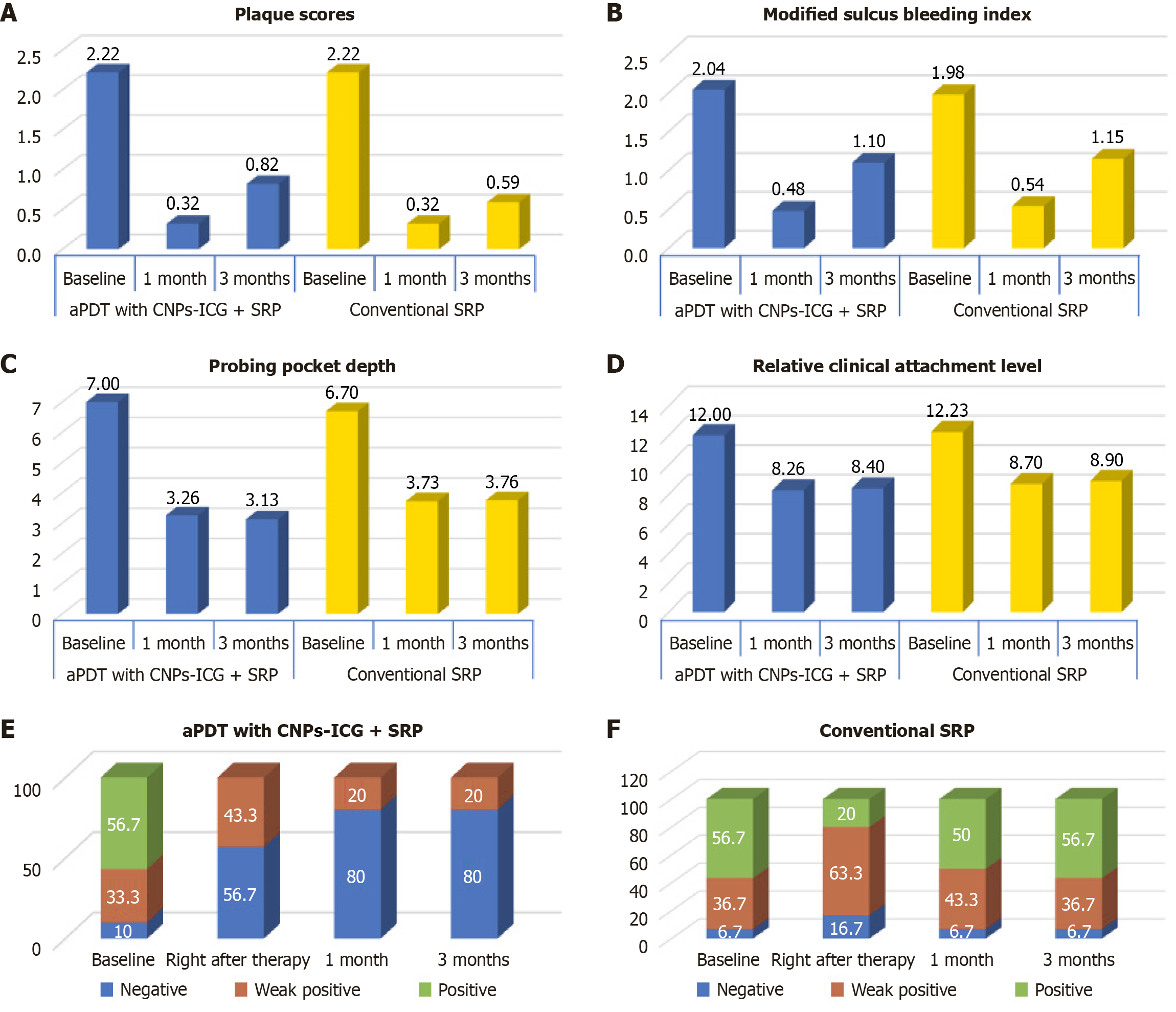 A: Mean plaque scores at different time intervals in both the groups; B: Mean sulcular bleeding scores at different time intervals in both the groups; C: Mean probing pocket depth at different time intervals; D: Comparison of Mean relative clinical attachment level at different time intervals in both the groups; E: Distribution of BANA scores at different time intervals in antimicrobial photodynamic therapy with CNPs-ICG + scaling and root planing (SRP) group; F: Distribution of BANA scores at different time intervals in conventional SRP group. CNPs-ICG: Indocyanine green-doped chitosan nanoparticles; aPDT: Antimicrobial photodynamic therapy; SRP: Scaling and root planning.