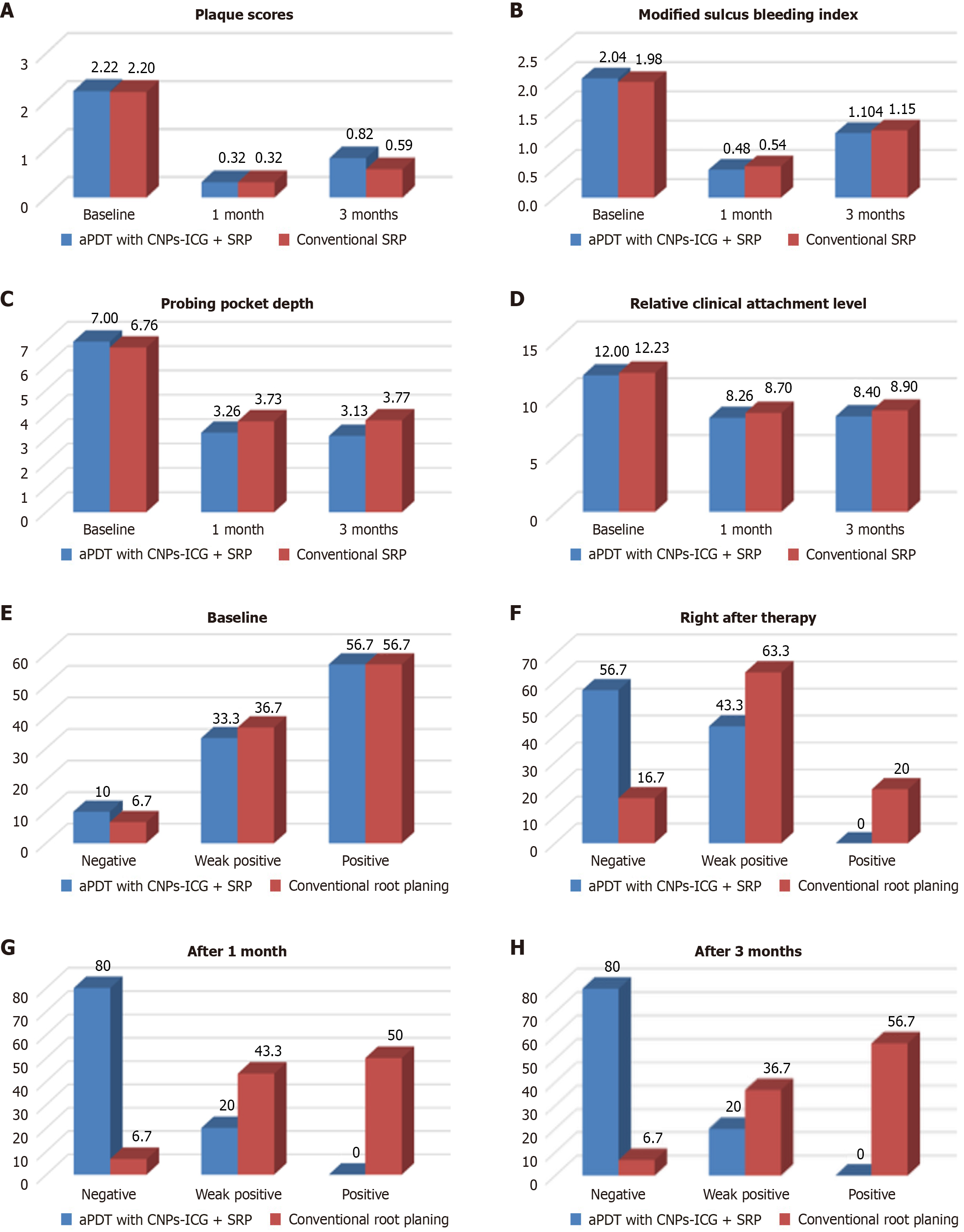 A: Mean plaque scores between the groups at different time intervals; B: Mean modified sulcus bleeding scores between the groups at different time intervals; C: Mean probing pocket depth between the groups at different time intervals; D: Mean relative clinical attachment level between the groups at different time intervals; E: Comparison of BANA test scores at baseline between the groups; F: Comparison of BANA test scores at right after therapy between the groups; G: Comparison of BANA test scores after 1 month between the groups; H: Comparison of BANA test scores after 3 months between the groups. CNPs-ICG: Indocyanine green-doped chitosan nanoparticles; aPDT: Antimicrobial photodynamic therapy; SRP: Scaling and root planning.