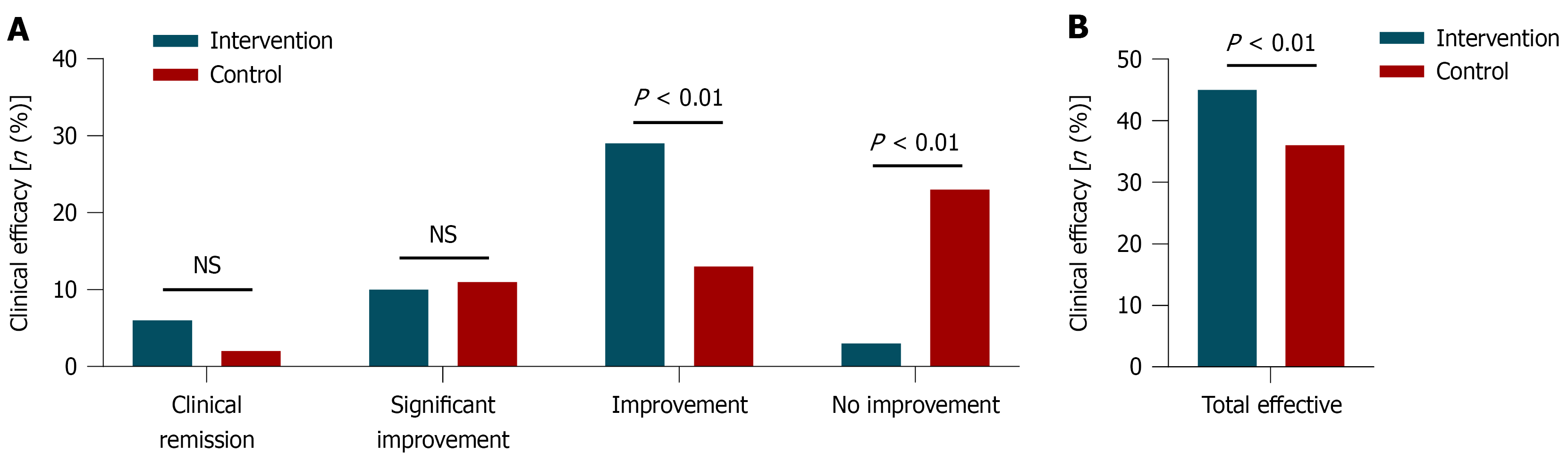Figure 3 Comparison of clinical efficacy between the intervention and control groups (intervention group = 48 cases, control group = 49 cases).