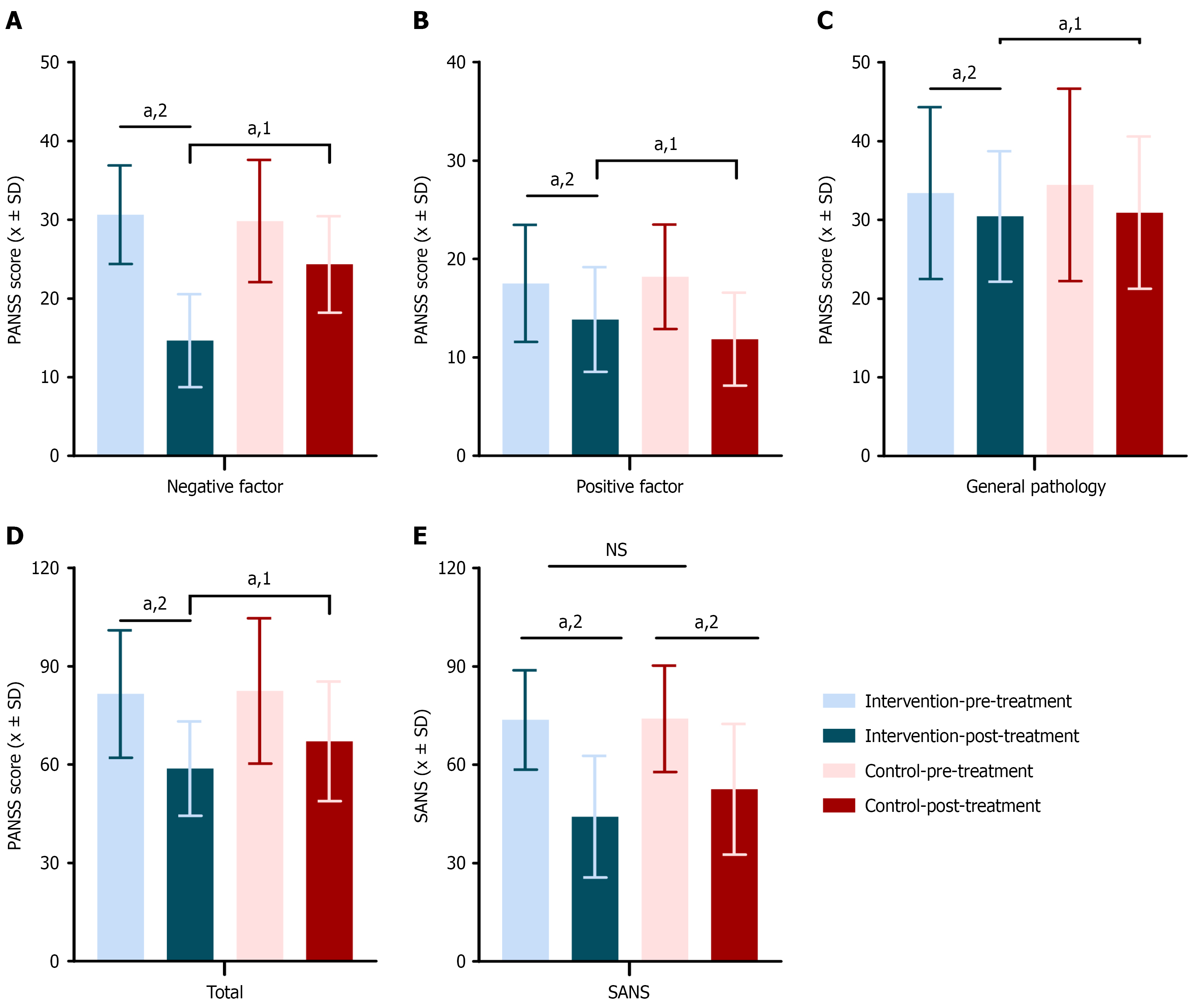 Positive and negative syndrome scale (PANSS) scores before and after treatment in the intervention and control groups. A: Negative factor score; B: Positive factor score; C: General psychopathology score; D: Total PANSS score; E: Scale for the assessment of negative symptoms scores for treatment outcomes in the schizophrenia intervention and control groups (intervention group = 48 cases, control group = 49 cases). 1Indicates a significant difference compared to the control group; 2Indicates a significant difference before and after the intervention; aP < 0.05. NS: Not significance; PANSS: Positive and negative syndrome scale; SANS: Scale for the assessment of negative symptoms.