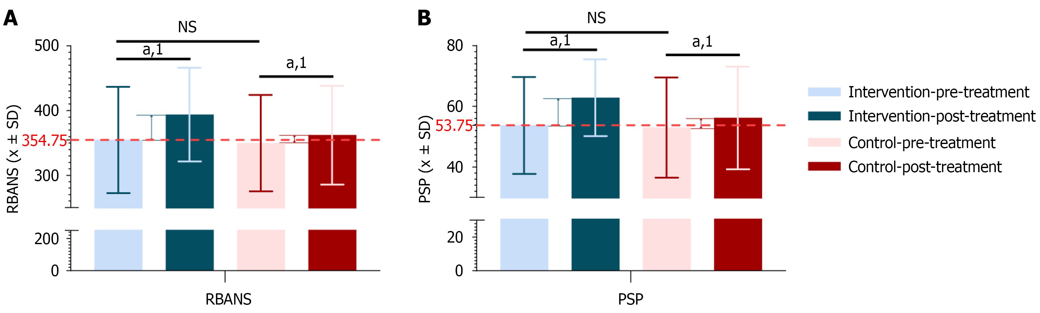 A: Repeatable battery for the assessment of neuropsychological status scores for treatment outcomes in the schizophrenia intervention and control groups; B: Personal and social performance scale scores for treatment outcomes in the schizophrenia intervention and control groups (intervention group = 48 cases, control group = 49 cases). 1Indicates a significant difference before and after the intervention; aP < 0.05. NS: Not significance; RBANS: Repeatable battery for the assessment of neuropsychological status; PSP: Personal and social performance scale.