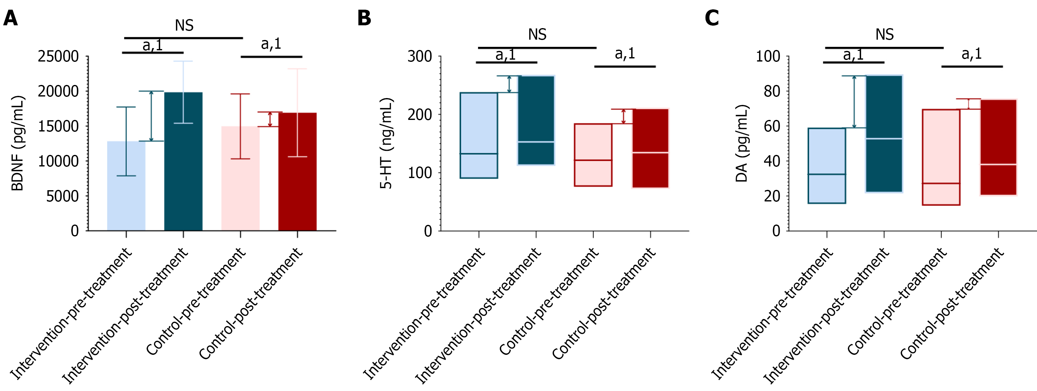 A: Analysis of changes in serum brain-derived neurotrophic factor levels before and after treatment in schizophrenia patients; B: Analysis of changes in serum serotonin levels before and after treatment in schizophrenia patients; C: Analysis of changes in serum dopamine levels before and after treatment in schizophrenia patients (intervention group = 48 cases, control group = 49 cases). 1Indicates a significant difference before and after the intervention; aP < 0.05. NS: Not significance; BDNF: Brain-derived neurotrophic factor; 5-HT: Serotonin; DA: Dopamine.