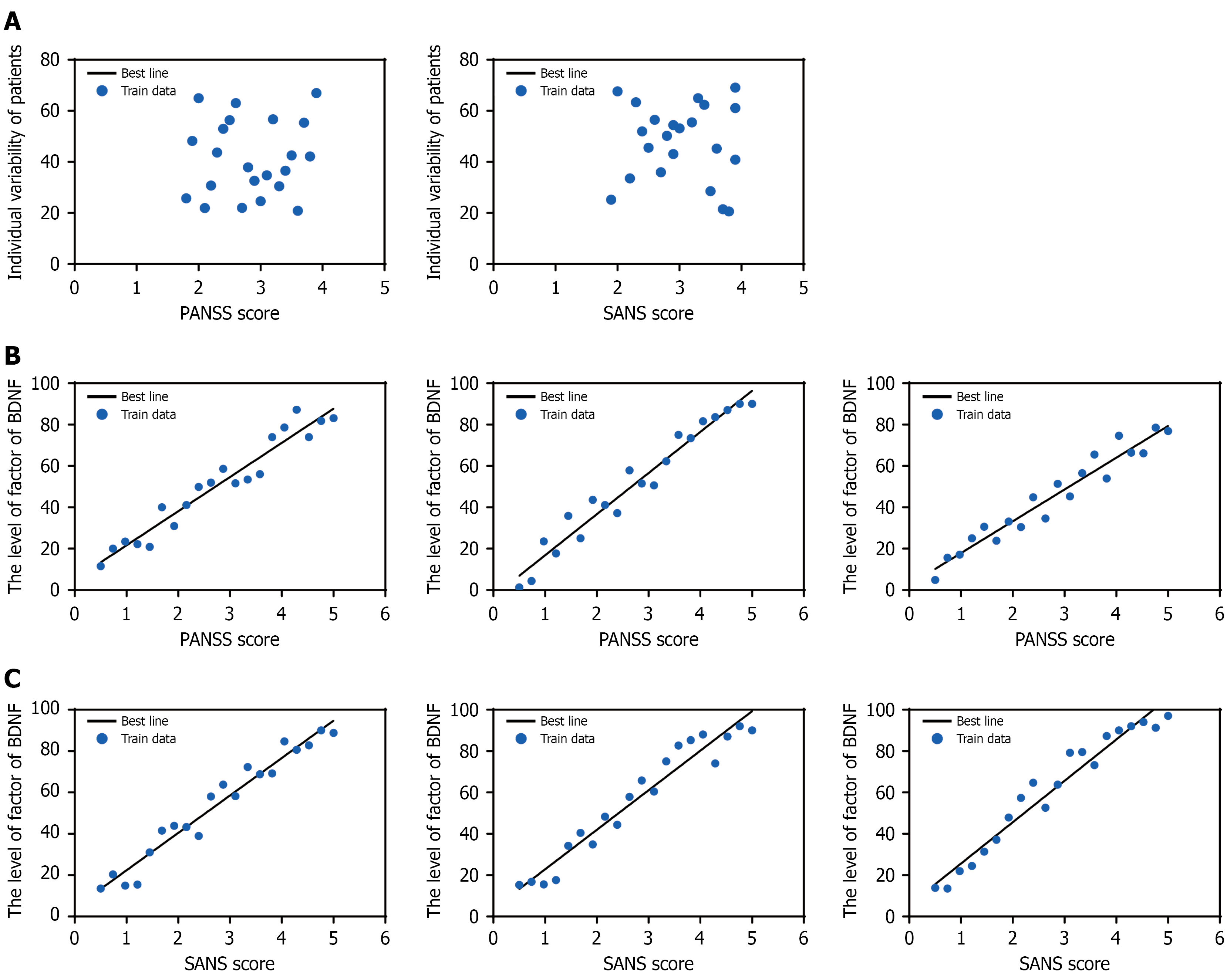 A: Correlation between individual variability and positive and negative syndrome scale (PANSS)/scale for the assessment of negative symptoms (SANS) scores; B: Correlation between serum brain-derived neurotrophic factor (BDNF), serotonin (5-HT), and dopamine (DA) levels and PANSS scores; C: Correlation between serum BDNF, 5-HT, and DA levels and SANS scores. PANSS: Positive and negative syndrome scale; SANS: Scale for the assessment of negative symptoms; BDNF: Brain-derived neurotrophic factor; 5-HT: Serotonin; DA: Dopamine.