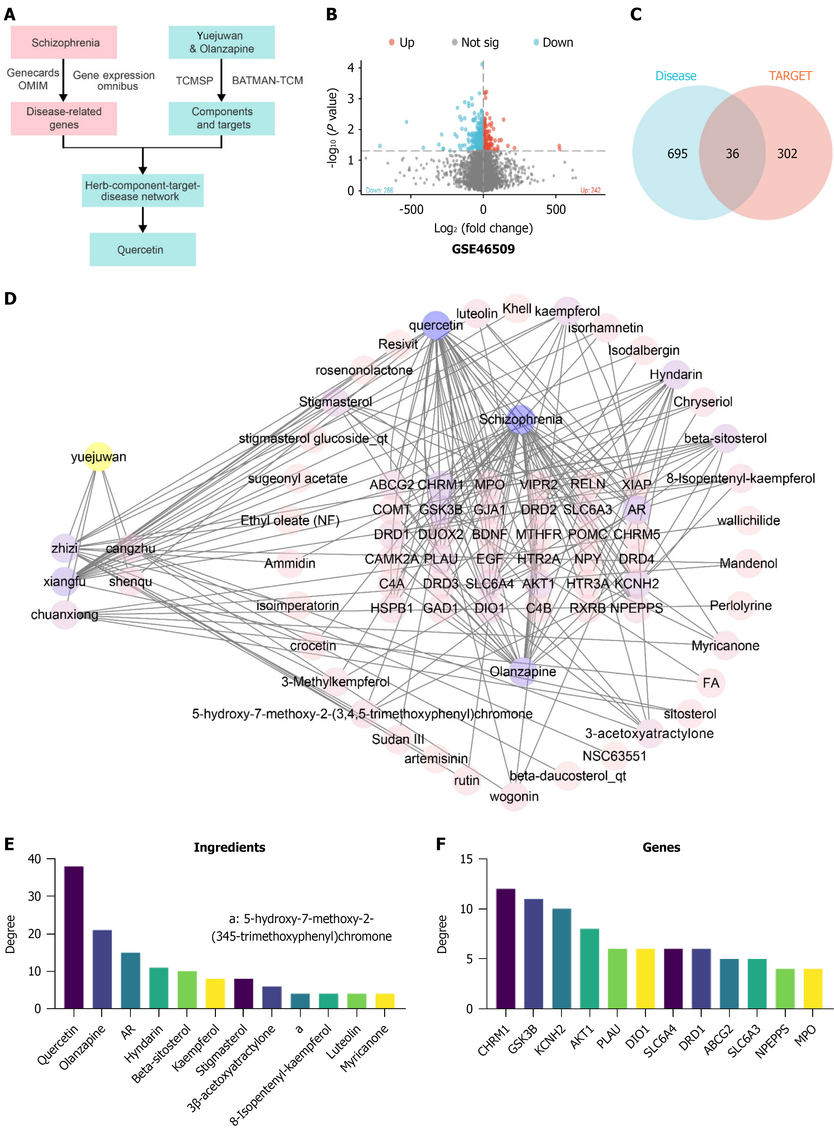 A: Flowchart of network pharmacology for identifying candidate genes and chemical components involved in schizophrenia relief via Yueju pill combined with olanzapine; B: Volcano plot based on differential expression analysis from GSE46509; C: Venn diagram showing the intersection of drug targets for effective chemical components of Yueju pill combined with olanzapine and disease targets related to schizophrenia; D: Network interaction map constructed using Cytoscape software for Yueju pill combined with olanzapine, effective components, targets, and disease, with Yueju pill combined with olanzapine on the left; the shared targets of the disease and drugs are shown in the central matrix area, and the effective components of Yueju pill combined with olanzapine are represented by circles. Node size and color intensity indicate the degree value; E: Top 12 active chemical components of Yueju pill combined with olanzapine ranked by degree value; F: Top 12 common targets shared by the disease and the drug components ranked by degree value. TCM: Traditional Chinese medicine.