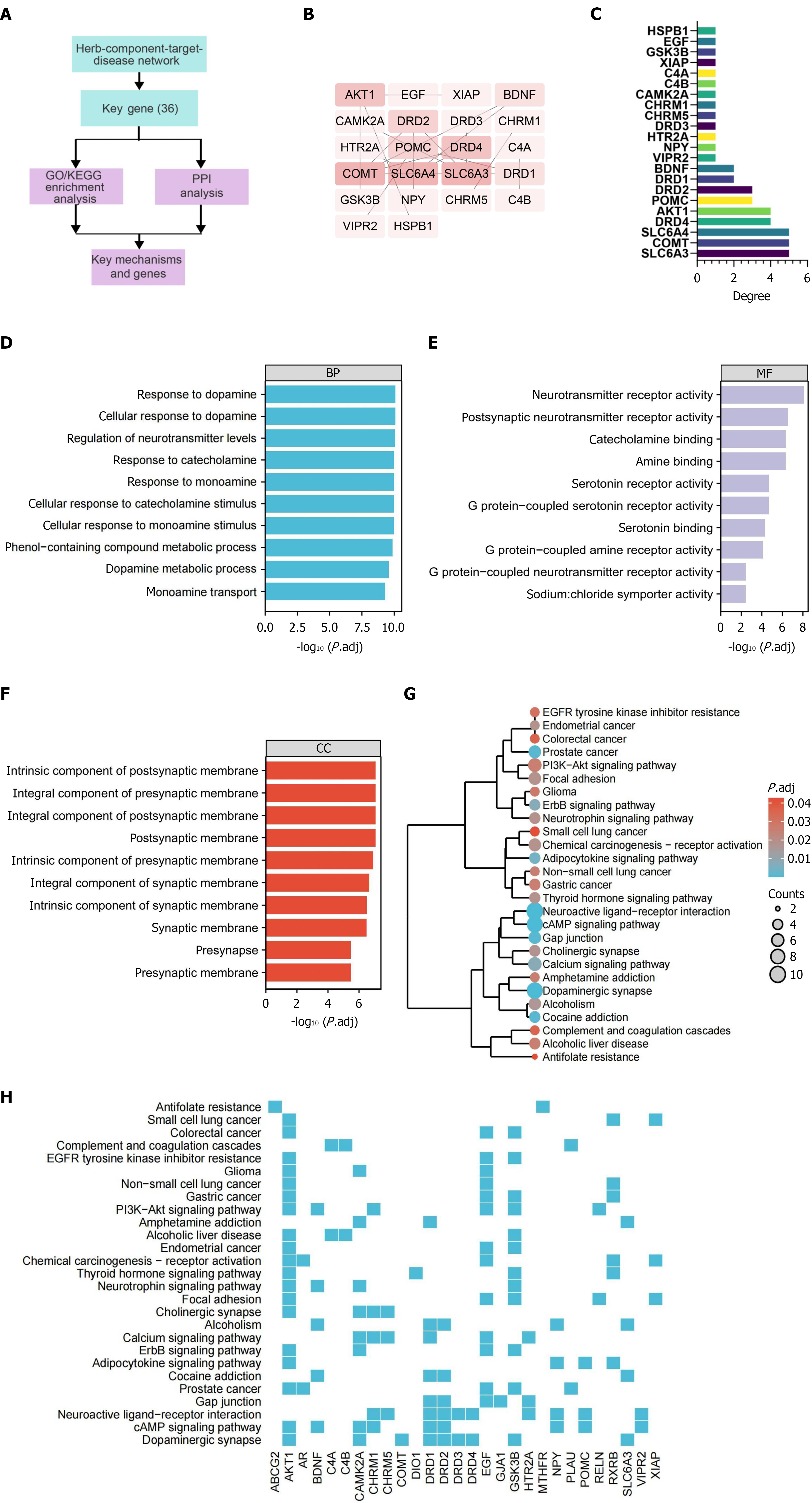 A: Simplified flowchart of the bioinformatics analysis for identifying key signaling pathways involved in schizophrenia relief via Yueju pill combined with olanzapine; B: Protein-protein interaction (PPI) network constructed using Cytoscape software based on 36 candidate genes regulated by Yueju pill combined with olanzapine, with larger text and darker background indicating higher degree values; C: Degree values within the PPI network; D-F: Partial results of Gene Ontology analysis for the 36 candidate genes regulated by Yueju pill combined with olanzapine, covering biological processes, molecular functions, and cellular components; G and H: Kyoto Encyclopedia of Genes and Genomes pathway analysis of the 36 candidate genes regulated by Yueju pill combined with olanzapine, presented as a hierarchical tree (G) and a gene heatmap (H), sorted by P adjust values. The size of the circles represents the number of selected genes, and the color indicates the enrichment analysis P value. GO: Gene Ontology; KEGG: Kyoto Encyclopedia of Genes and Genomes; PPI: Protein-protein interaction.