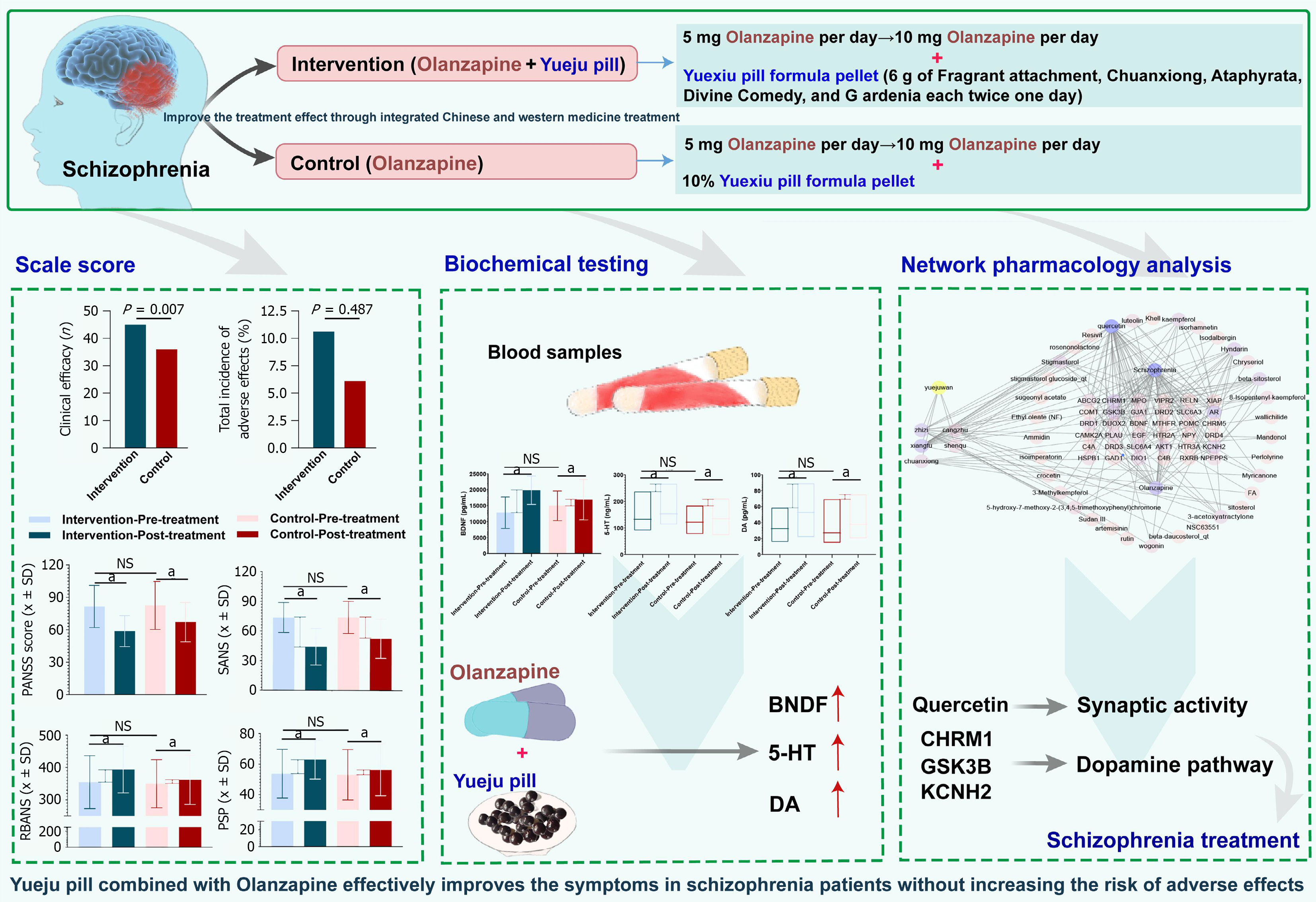 Figure 10 Yueju pill combined with olanzapine effectively improves the symptoms in schizophrenia patients without increasing the risk of adverse effects.