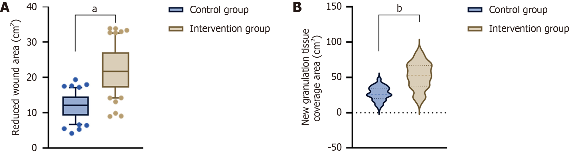 aP < 0.001 vs control; bP < 0.001 vs control. A: Comparison of reduced wound area between the two groups after 4 weeks of nursing; B: New granulation tissue coverage area between the two groups after 4 weeks of nursing.