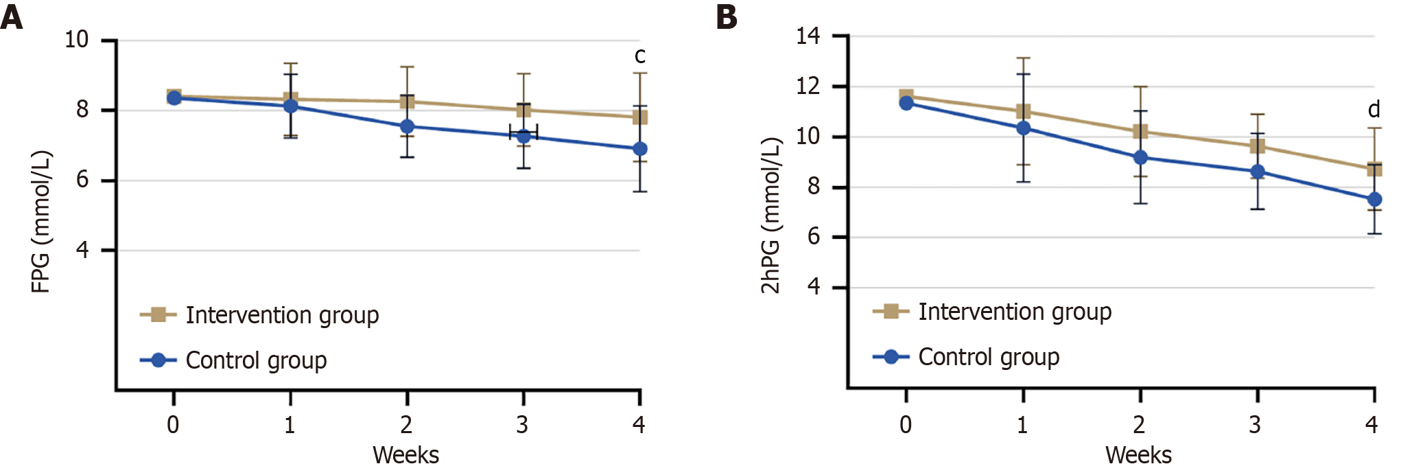 cP < 0.05 vs control; dP < 0.05 vs control. A: Comparison of fasting plasma glucose between the two groups before and after intervention; B: 2-hour postprandial blood glucose comparison between the two groups before and after intervention. FPG: Fasting plasma glucose; 2hPG: 2-hour postprandial blood glucose.