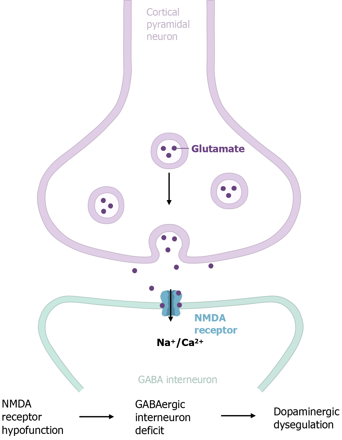 N-methyl-D-aspartate receptor hypofunction on GABAergic interneurons disrupts the excitatory-inhibitory balance in cortical circuits, leading to excessive glutamatergic activity. This imbalance impairs neural synchrony and information processing, contributing to positive and cognitive symptoms. Furthermore, N-methyl-D-aspartate receptor dysfunction induces deficits in GABAergic interneurons, resulting in aberrant local circuit dynamics and long-range disconnections, including dysregulation of the dopamine system. NMDA: N-methyl-D-aspartate; GABA: Gamma aminobutyric acid.