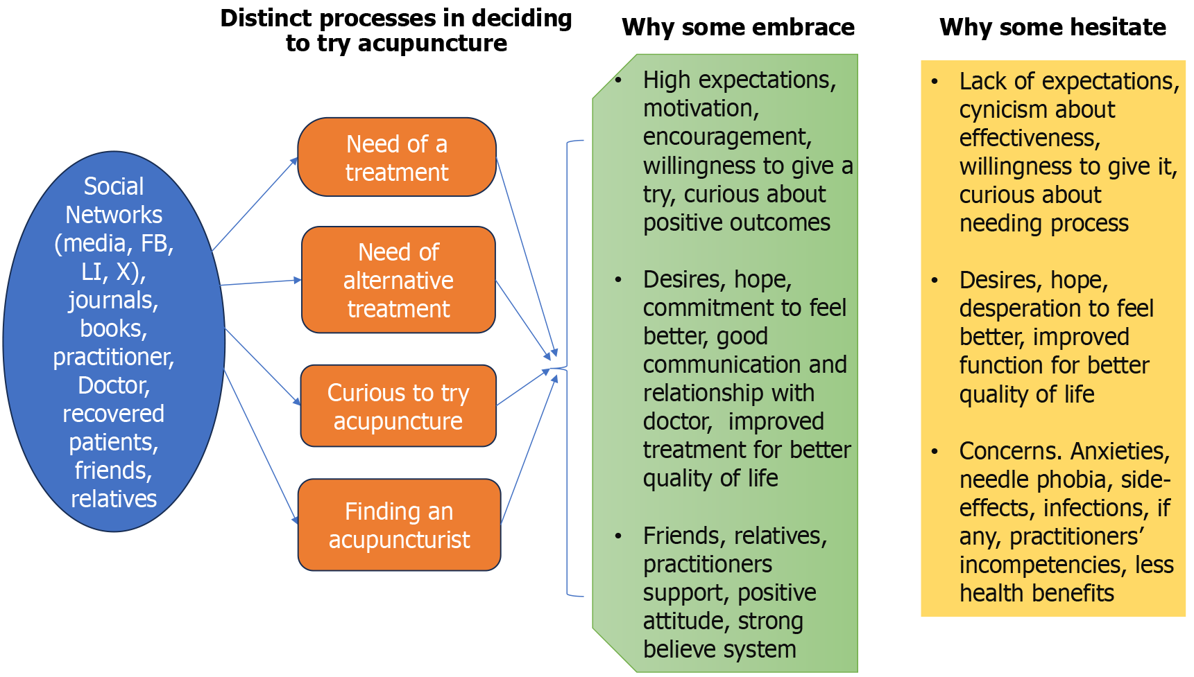 A thematic map showing the decision-making processes that lead to behavioral differences in insomnia sufferers’ engagement with acupuncture treatment, including why some individuals are more receptive while others are more reluctant. FB: Facebook; LI: LinkedIn; X: X Corp.
