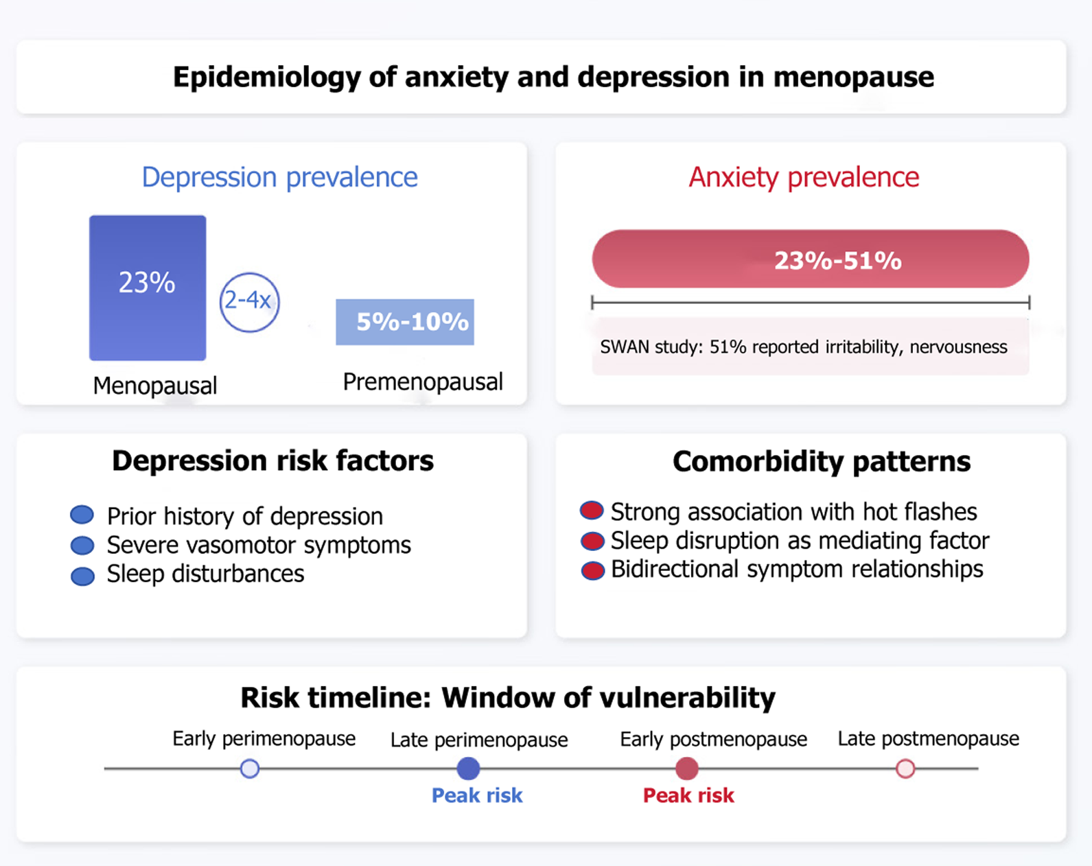 This figure presents the prevalence rates, risk factors, comorbidity patterns, and temporal vulnerability patterns of mood disorders during the menopausal transition. Depression prevalence reaches 23% in menopausal women (2.4-fold higher than premenopausal women), while anxiety prevalence ranges from 23% to 51%. The “window of vulnerability” concept illustrates peak risk periods during late perimenopause and early postmenopause, with sleep disruption serving as a key mediating factor in the bidirectional relationships between vasomotor symptoms and mood disorders.