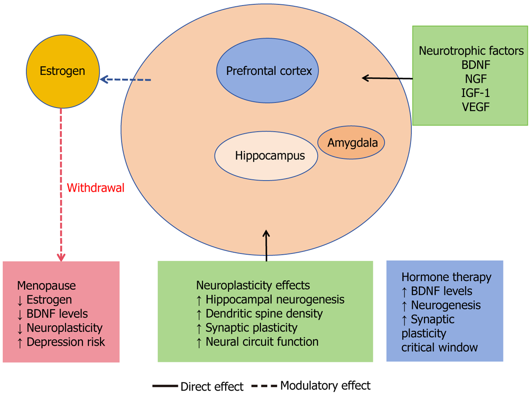 This diagram illustrates how estrogen regulates neurotrophic factors and neuroplasticity in the brain, showing how declining estrogen levels during menopause lead to reduced brain-derived neurotrophic factor and other neurotrophic factors, subsequently affecting hippocampal neurogenesis, dendritic spine density, and synaptic plasticity, ultimately increasing depression risk. Additionally, the diagram demonstrates how hormone replacement therapy can have positive effects through restoring brain-derived neurotrophic factor levels and enhancing neuroplasticity when administered within the “critical window” of intervention. BDNF: Brain-derived neurotrophic factor; NGF: Nerve growth factor; IGF-1: Insulin-like growth factor-1; VEGF: Vascular endothelial growth factor.