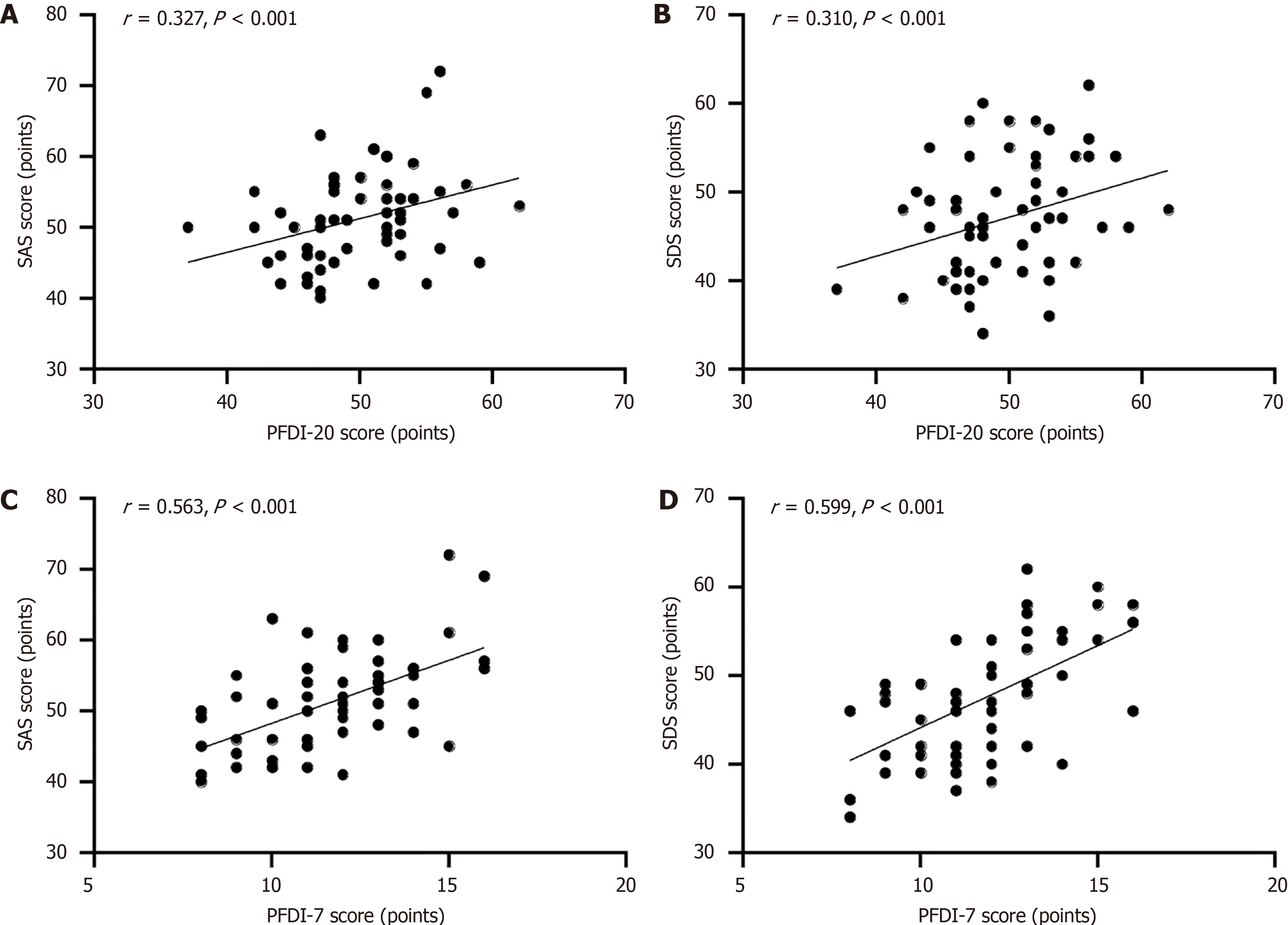 A: Correlation analysis of Pelvic Floor Dysfunction Inventory 20 score and Self-Rating Anxiety Scale score; B: Correlation analysis of Pelvic Floor Dysfunction Inventory 20 score and Self-Rating Depression Scale score; C: Correlation analysis of Pelvic Floor Impact Questionnaire 7 score and Self-Rating Anxiety Scale score; D: Correlation analysis of Pelvic Floor Impact Questionnaire 7 score and Self-Rating Depression Scale score. SAS: Self-Rating Anxiety Scale; PFDI-20: Pelvic Floor Dysfunction Inventory 20; SDS: Self-Rating Depression Scale; PFIQ-7: Pelvic Floor Impact Questionnaire 7.