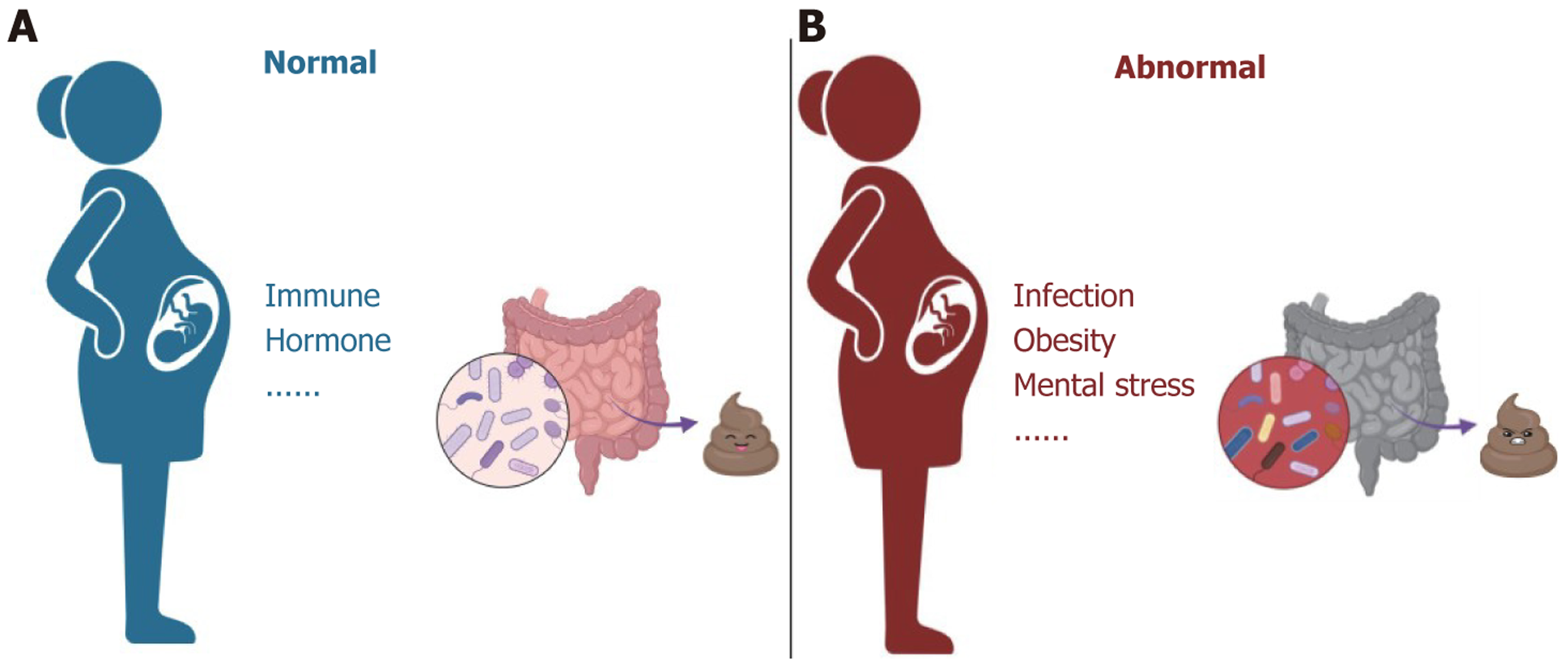 A: Effect on the mother’s gut microbiota during normal pregnancy; B: Effect on the mother’s intestinal flora under adverse conditions.