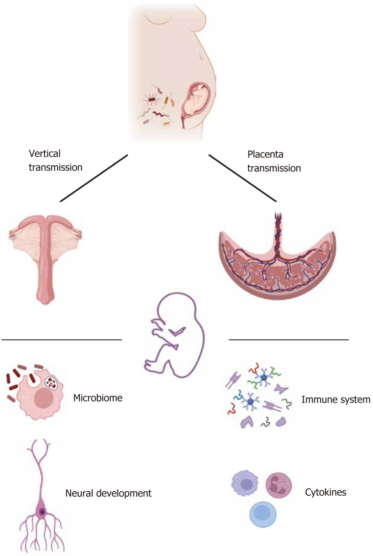 The maternal microbiome can affect the development of the offspring’s immune and nervous systems through vertical and placental transmission.
