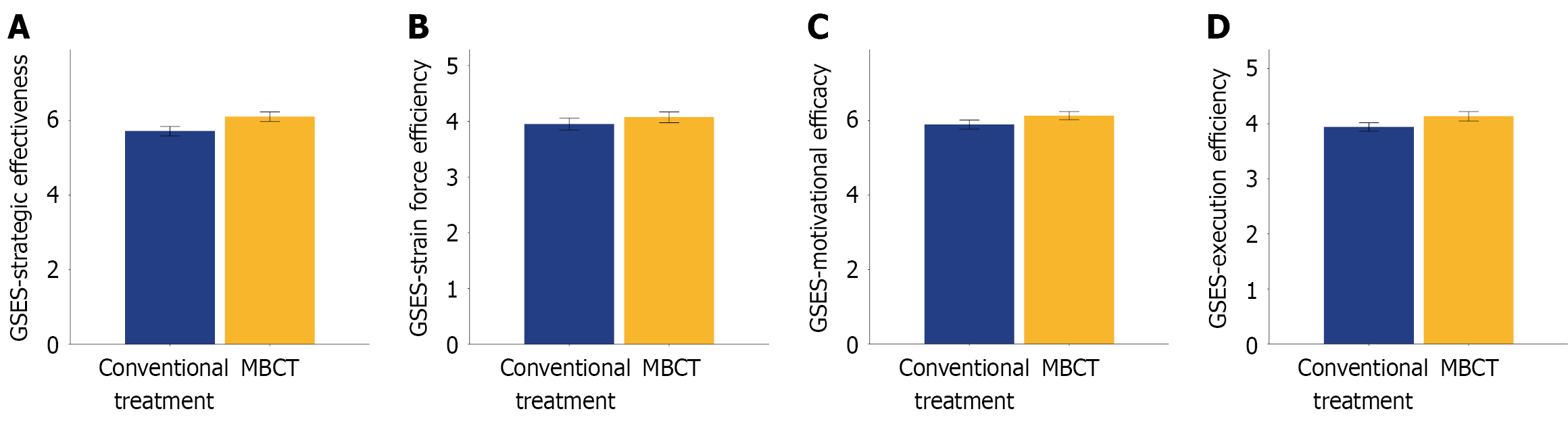 A: Strategic effectiveness; B: Strain force efficiency; C: Motivational efficacy; D: Execution efficiency. GSES: General self-efficacy perception scale; MBCT: Mindfulness-based cognitive therapy.
