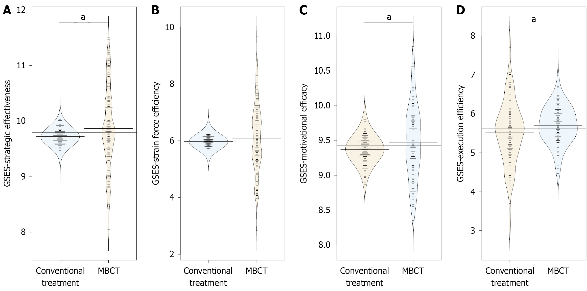 A: Strategic effectiveness; B: Strain force efficiency; C: Motivational efficacy; D: Execution efficiency. aP < 0.05. GSES: General self-efficacy perception scale; MBCT: Mindfulness-based cognitive therapy.