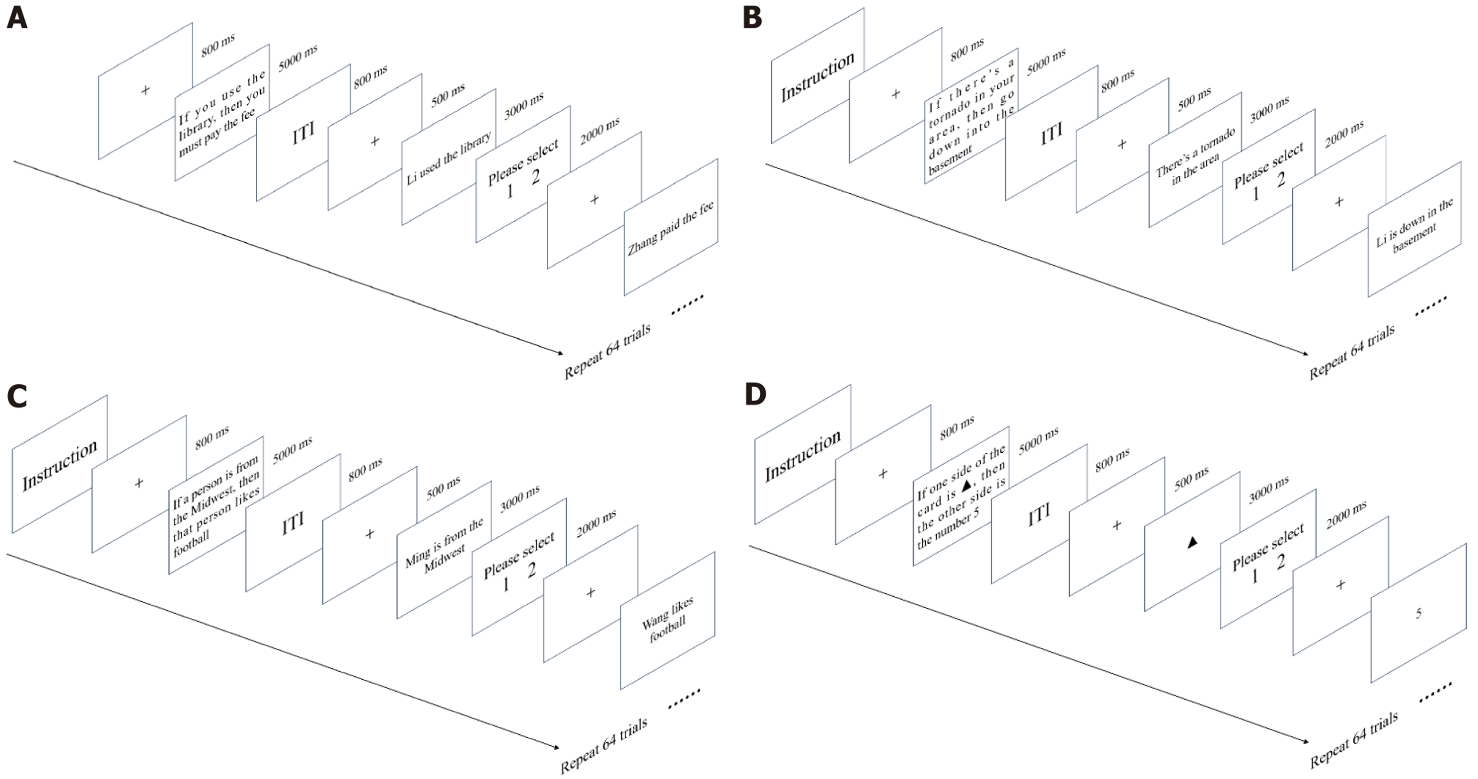 A: Social contract Wason selection task; B: Precautionary Wason selection task; C: Descriptive Wason selection task; D: Abstract Wason selection task.