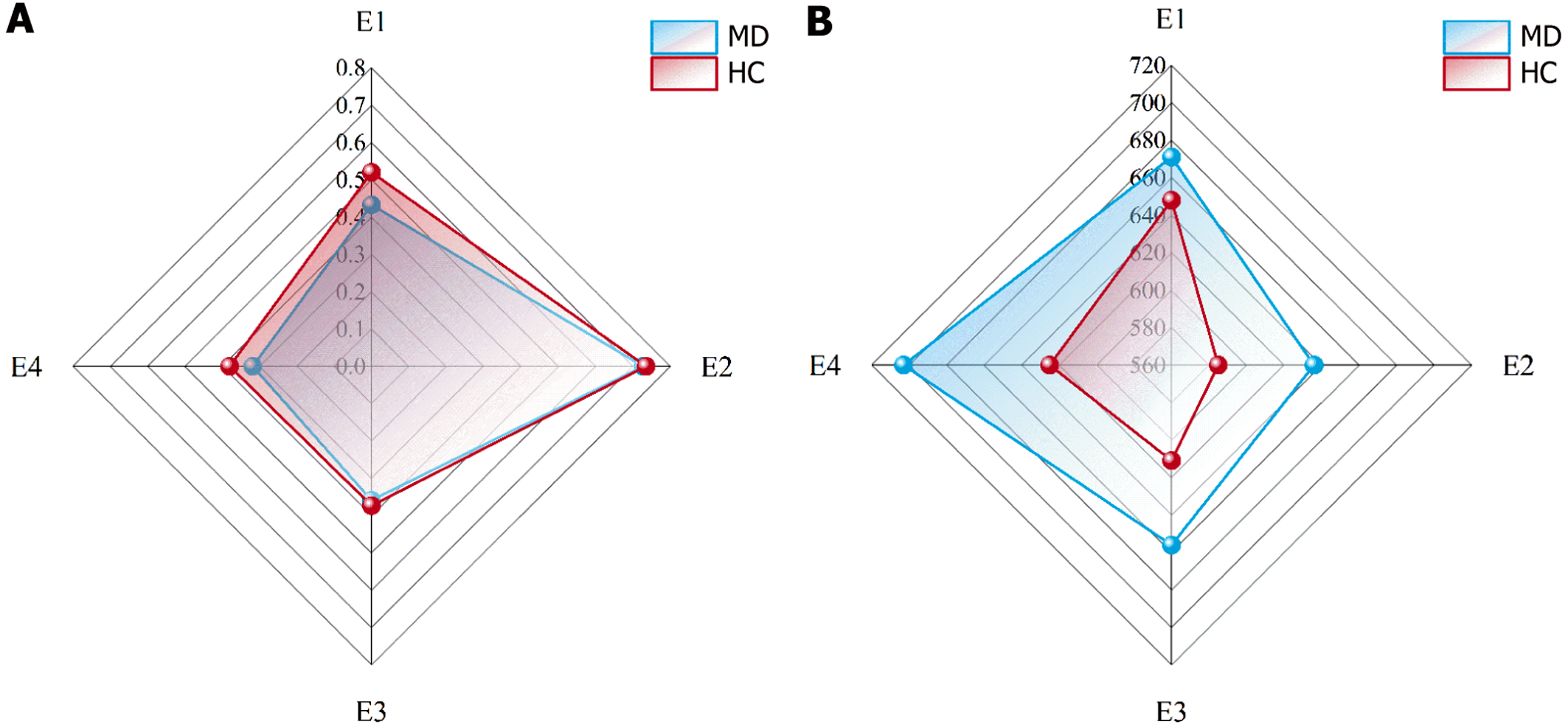 A: E1-E4 accuracy radar chart; B: E1-E4 reaction times radar chart. HC: Healthy control; MD: Major depression; E1: Social contract Wason selection task; E2: Precautionary Wason selection task; E3: Descriptive Wason selection task; E4: Abstract Wason selection task.