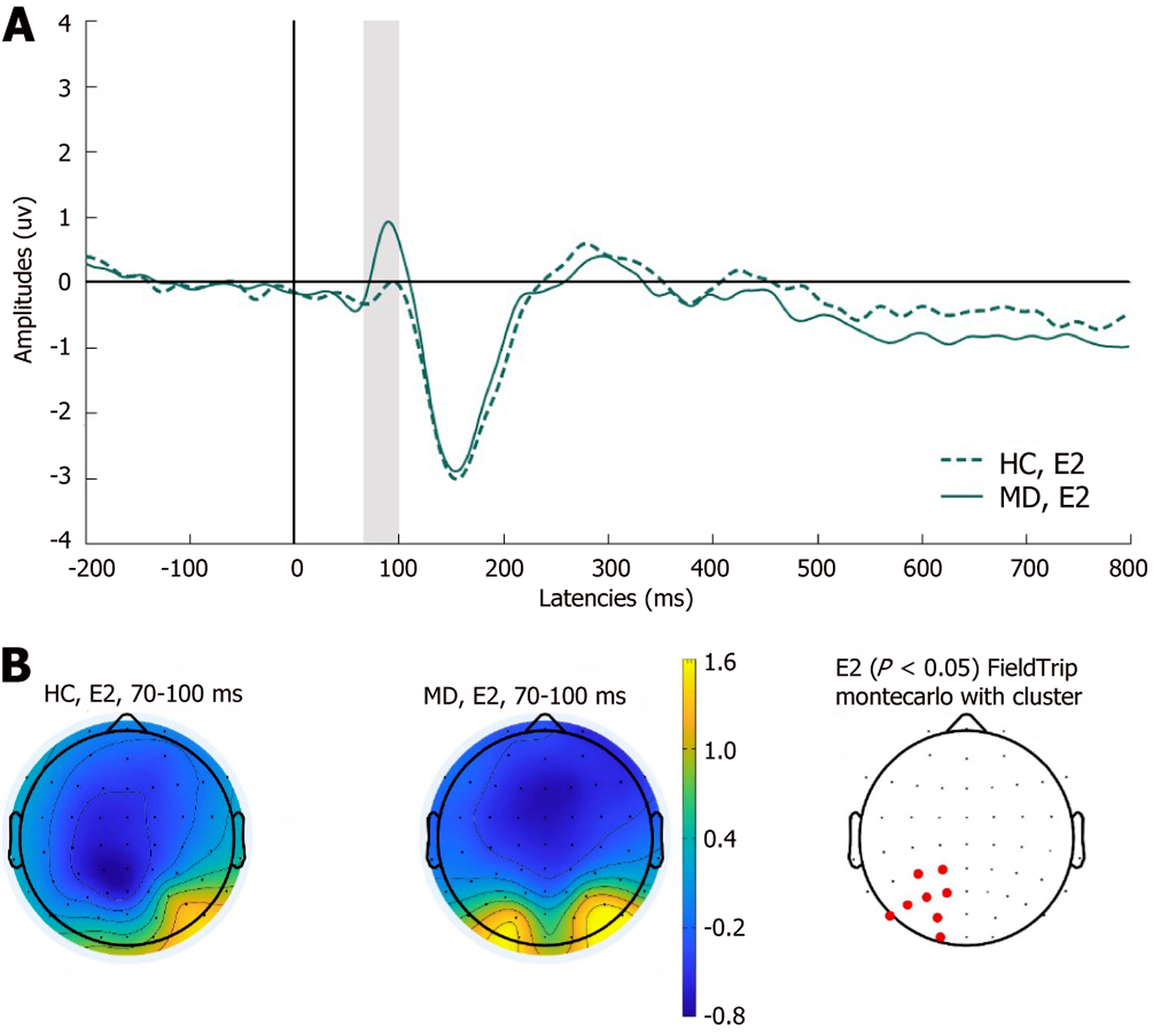 A: Grand averaged event-related potentials of experiment 2 in the healthy control (HC) group and major depression (MD) group; The time window corresponding to P100 is indicated by the gray shaded area; B: A topography map of the experiment 2 condition depicting the grand average amplitude of the difference wave within the 70-100 ms timeframe for the HC group and the MD group. HC: Healthy controls; MD: Major depression; E2: Precautionary Wason selection task.