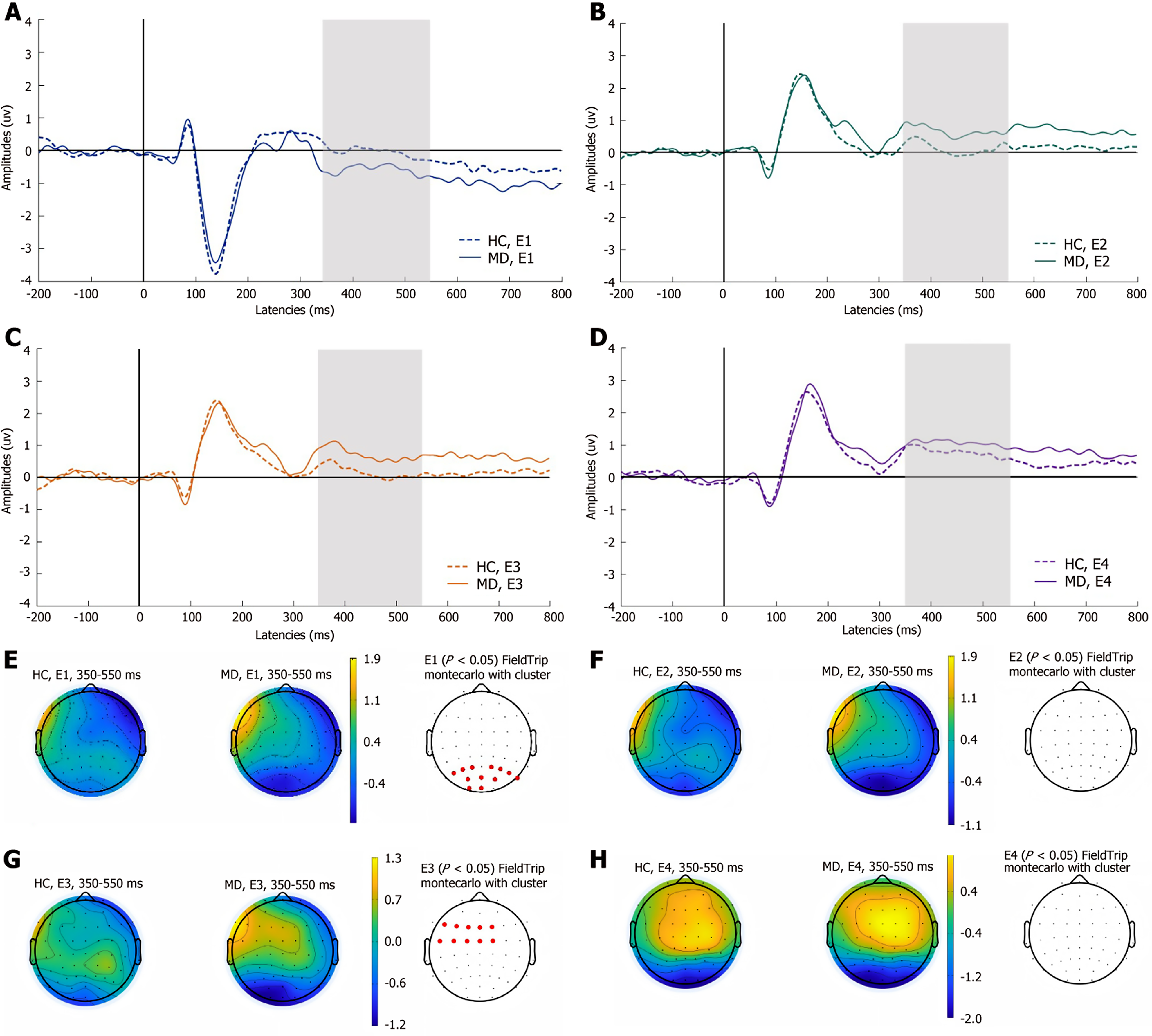 A-D: Grand averaged event-related potentials of different experiments in the healthy control (HC) and major depression (MD) group; the time window corresponding to late positive potential (LPP) early phase is indicated by the gray shaded area; E-H: A topography map of different experiments depicting the mean amplitude of LPP early phase within the 350-550 ms time window for the HC and MD group. HC: Healthy controls; MD: Major depression; E1: Social contract Wason selection task; E2: Precautionary Wason selection task; E3: Descriptive Wason selection task; E4: Abstract Wason selection task.