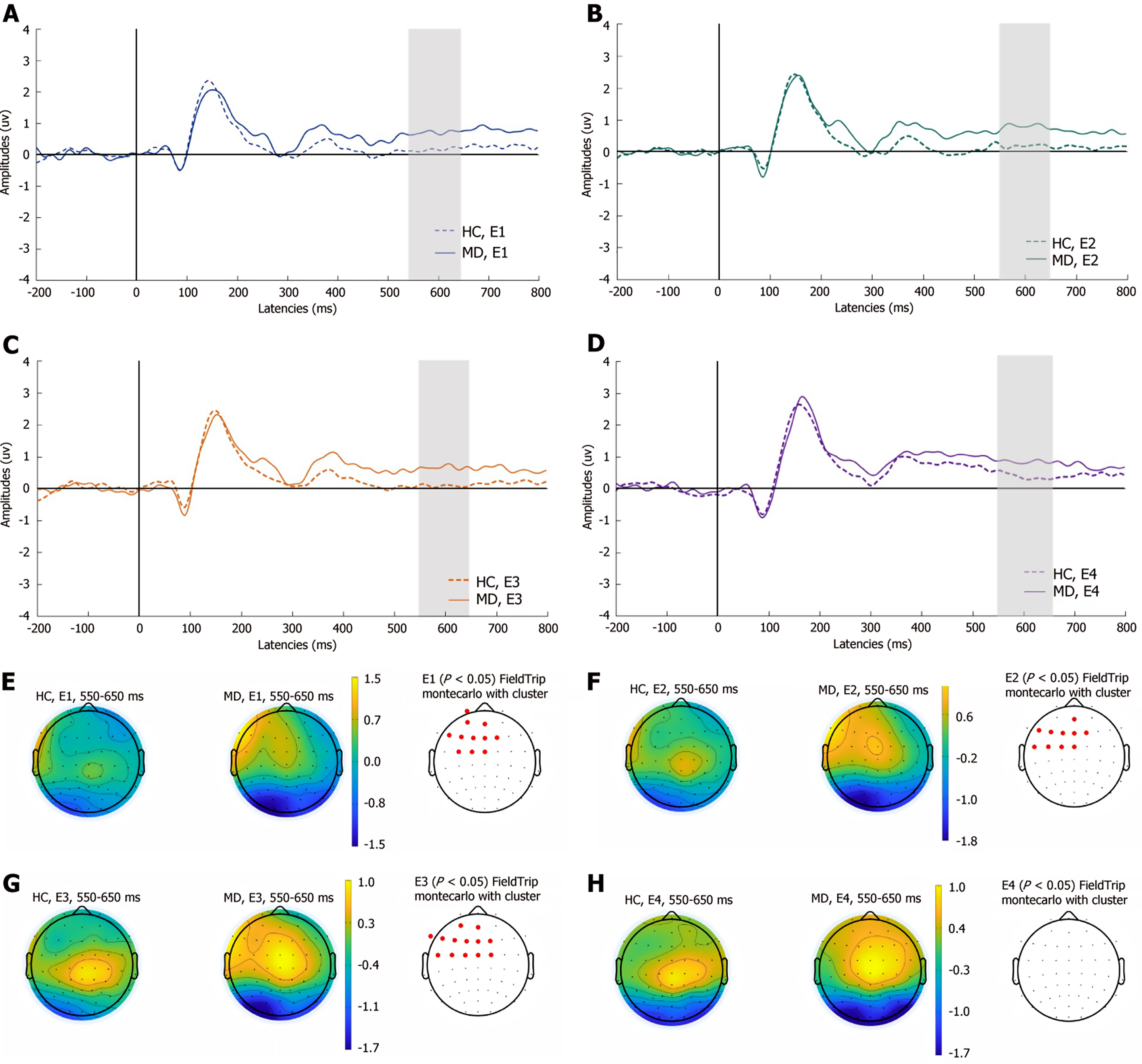 A-D: Grand averaged event-related potentials of different experiments in the healthy control (HC) and major depression (MD) group; the time window corresponding to late positive potential (LPP) medium phase is indicated by the gray shaded area; E-H: A topography map of different experiments depicting the mean amplitude of LPP medium phase within the 550-650 ms time window for the HC and MD group. HC: Healthy controls; MD: Major depression; E1: Social contract Wason selection task; E2: Precautionary Wason selection task; E3: Descriptive Wason selection task; E4: Abstract Wason selection task.