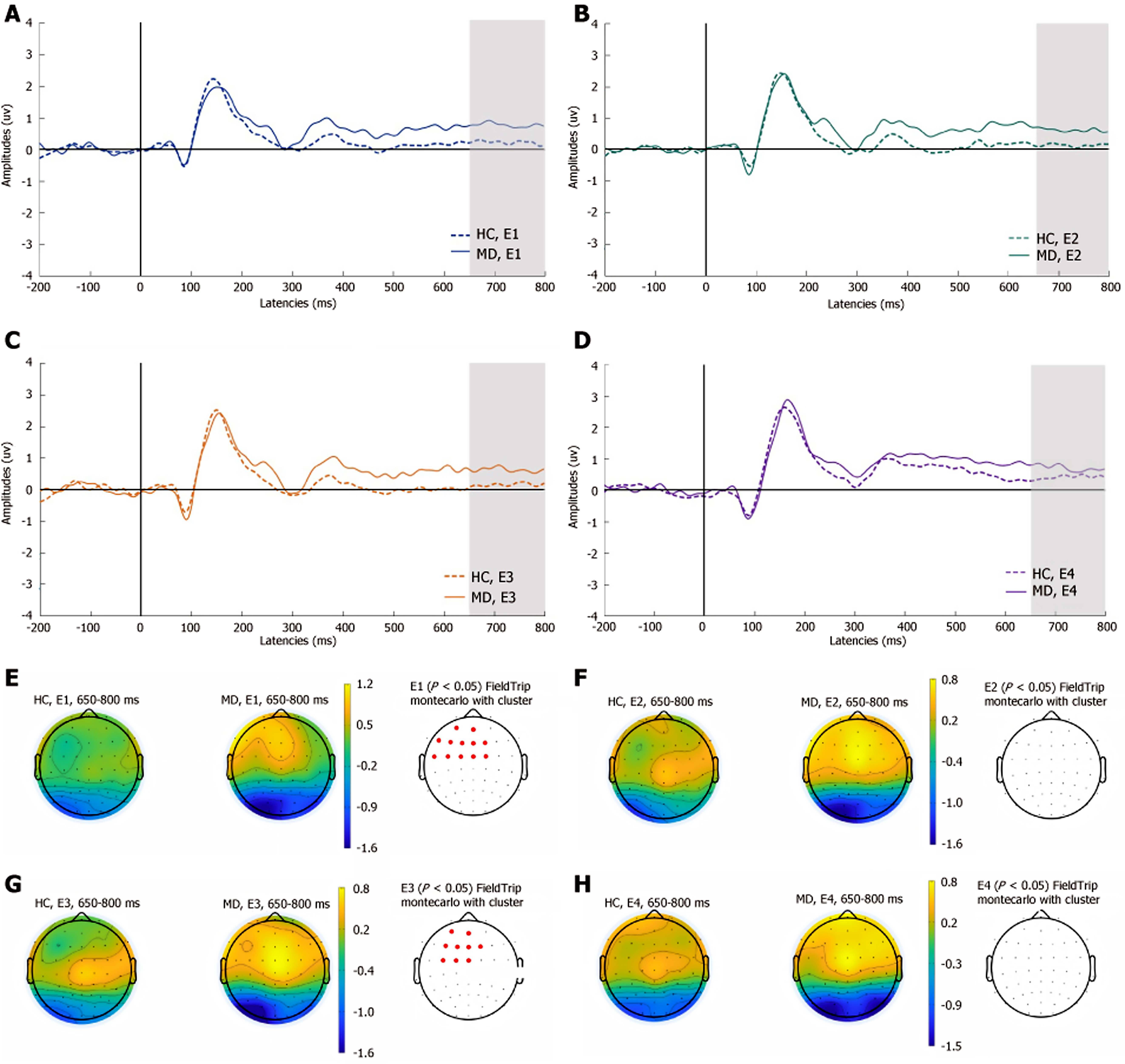 A-D: Grand averaged event-related potentials of different experiments in the healthy control (HC) and major depression (MD) group; the time window corresponding to late positive potential (LPP) late phase is indicated by the gray shaded area; E-H: A topography map of different experiments depicting the mean amplitude of LPP late phase within the 650-800 ms time window for the HC and MD group. HC: Healthy controls; MD: Major depression; E1: Social contract Wason selection task; E2: Precautionary Wason selection task; E3: Descriptive Wason selection task; E4: Abstract Wason selection task.