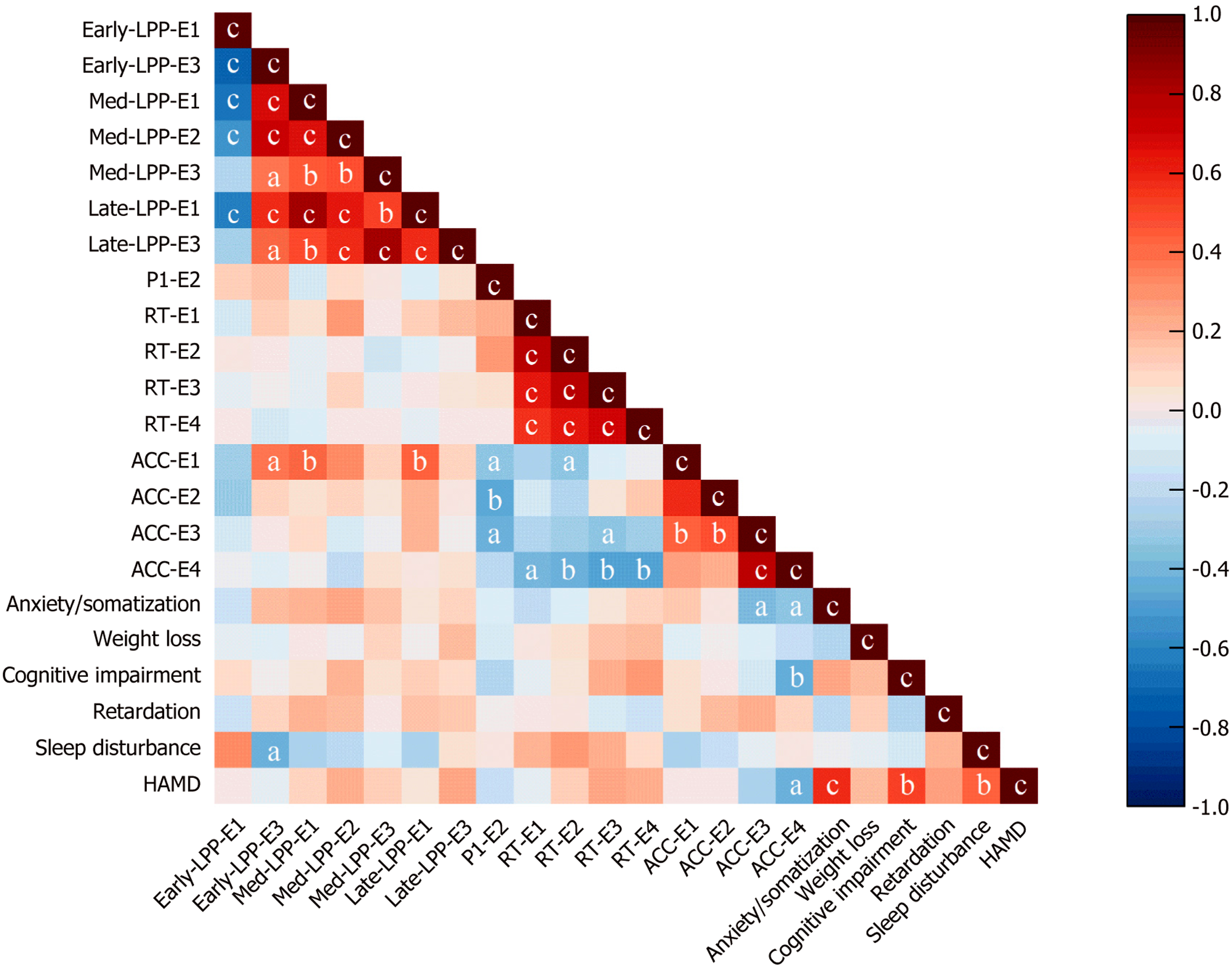Positive correlations are indicated in red, while negative correlations are marked in blue. aP < 0.05; bP < 0.01, cP < 0.001. MD: Major depression; HAMD: Hamilton Depression Scale; Early-LPP-E1: Late positive potentials early phase of experiment 1; Early-LPP-E3: Late positive potentials early phase of experiment 3; Med-LPP-E1: Late positive potentials medium phase of experiment 1; Med-LPP-E2: Late positive potentials medium phase of experiment 2; Med-LPP-E3: Late positive potentials medium phase of experiment 3; Late-LPP-E1: Late positive potentials late phase of experiment 1; Late-LPP-E3: Late positive potentials late phase of experiment 3; P1-E2: The P100 of experiment 2.