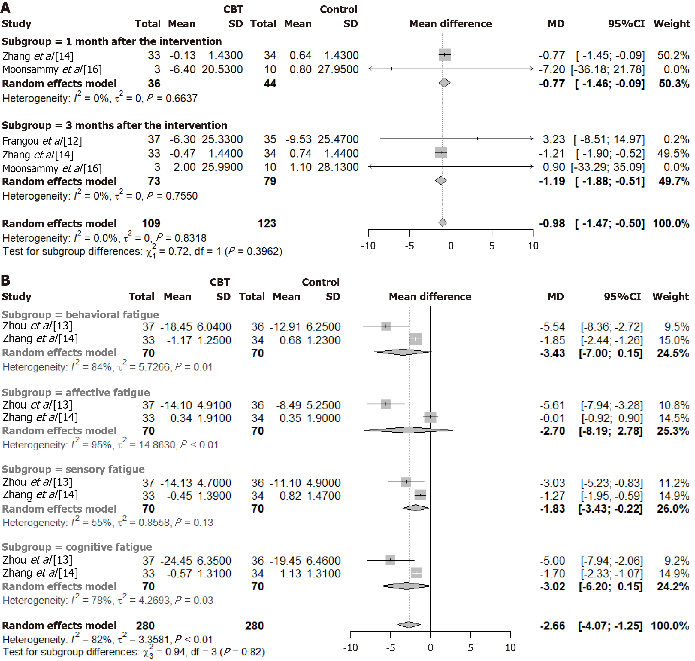 A: Total cancer-related fatigue; B: Subscales of cancer-related fatigue (negative values indicate a reduction in cancer-related fatigue). CBT: Cognitive behavioral therapy; CI: Confidence interval.