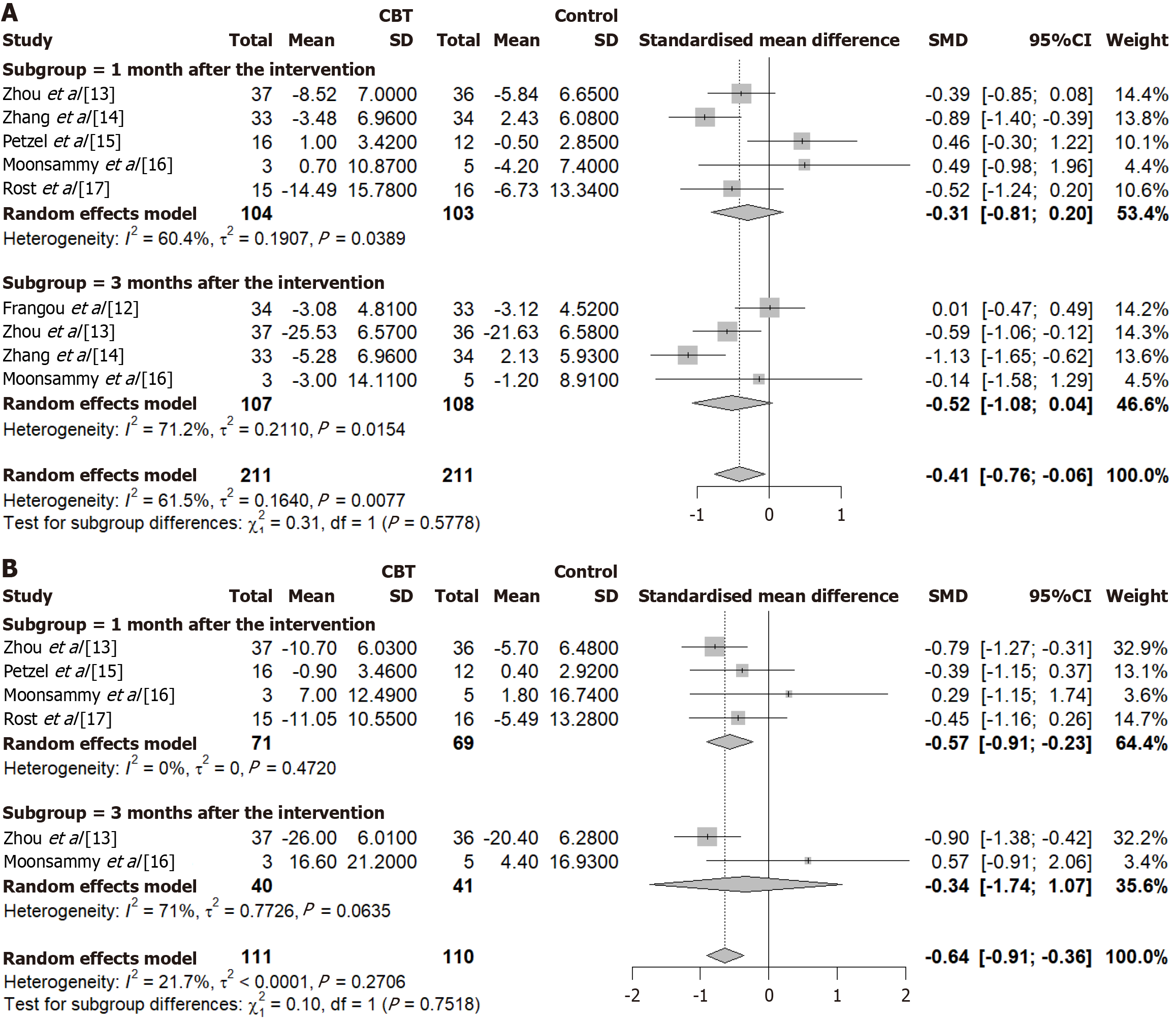 A: Depression; B: Anxiety (negative values indicate a reduction in depression or anxiety). CBT: Cognitive behavioral therapy; CI: Confidence interval.