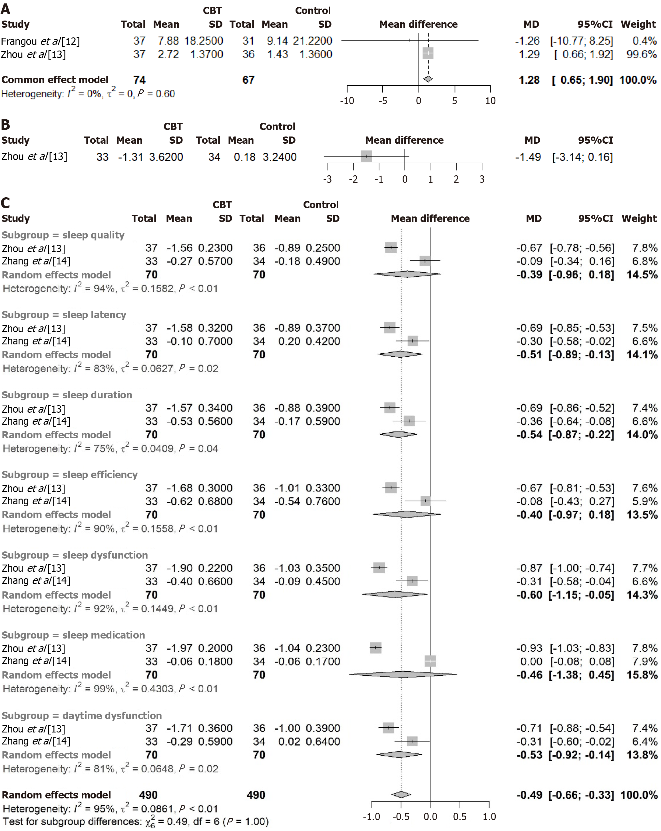 A: Quality of life-general health; B: Quality of sleep; C: Subscales of quality of sleep (positive value indicates an improvement in quality of life or quality of sleep). CBT: Cognitive behavioral therapy; CI: Confidence interval.
