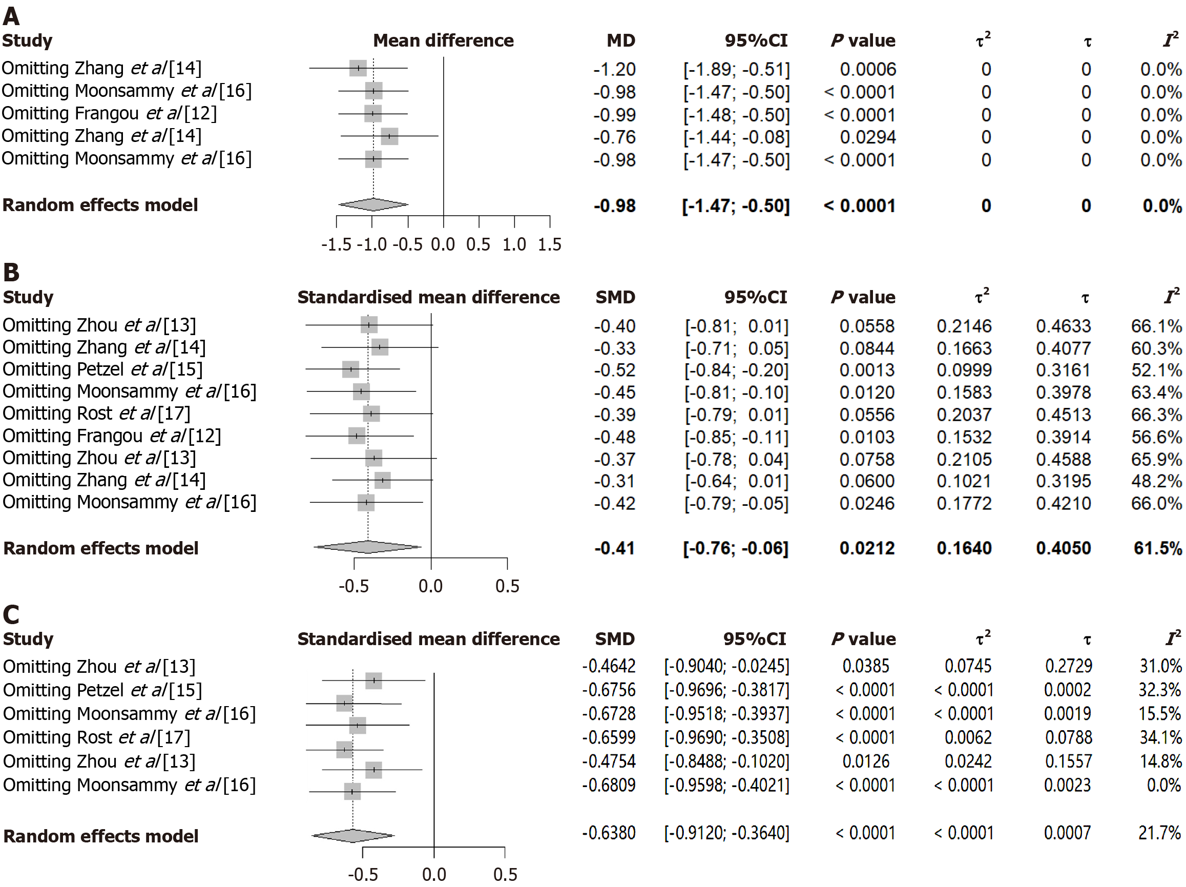 Figure 6 Sensitivity analysis of cancer-related fatigue, depression, and anxiety of patients with ovarian cancer after cognitive behavioral therapy treatment.