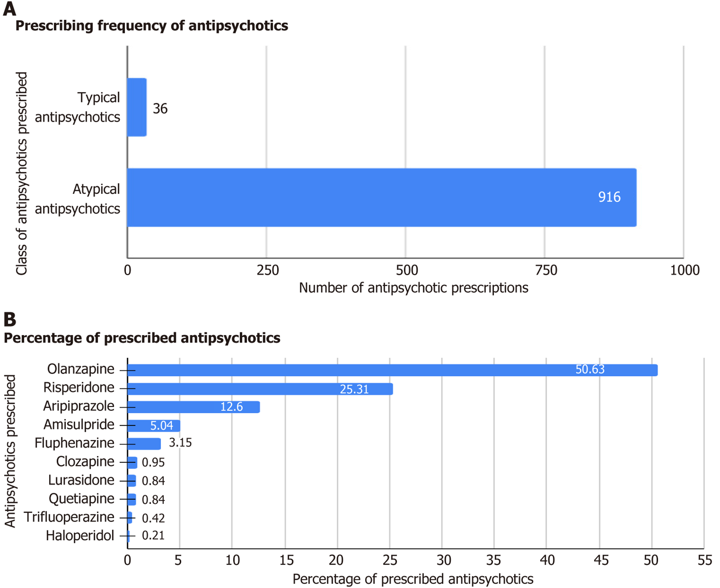 A: Prescribing frequency of antipsychotics; B: Percentage of prescribed antipsychotics.